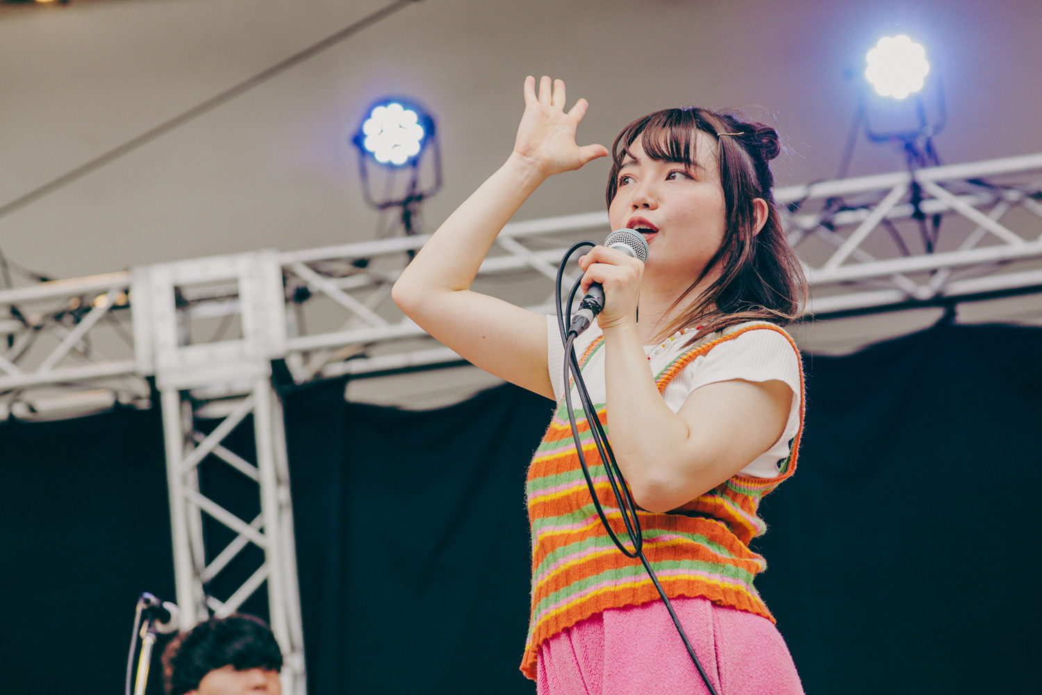 MCでは「声出しOKなんですよね? 初めましての人どのくらいいるかな? 楽しんでもらえてますか?」とニコニコしながら客席とコミュニケーションを取る。軽快な前半から一転、中盤では大人っぽい一面を見せる。「残響」では市川もギターを持ってサウンドに厚みを加える。ピアノソロも美しく、映秀。が情緒豊かにフェイクをきかせると客席は釘付けに。野音を吹き抜ける強い風が、楽曲の切なさを盛り上げる。