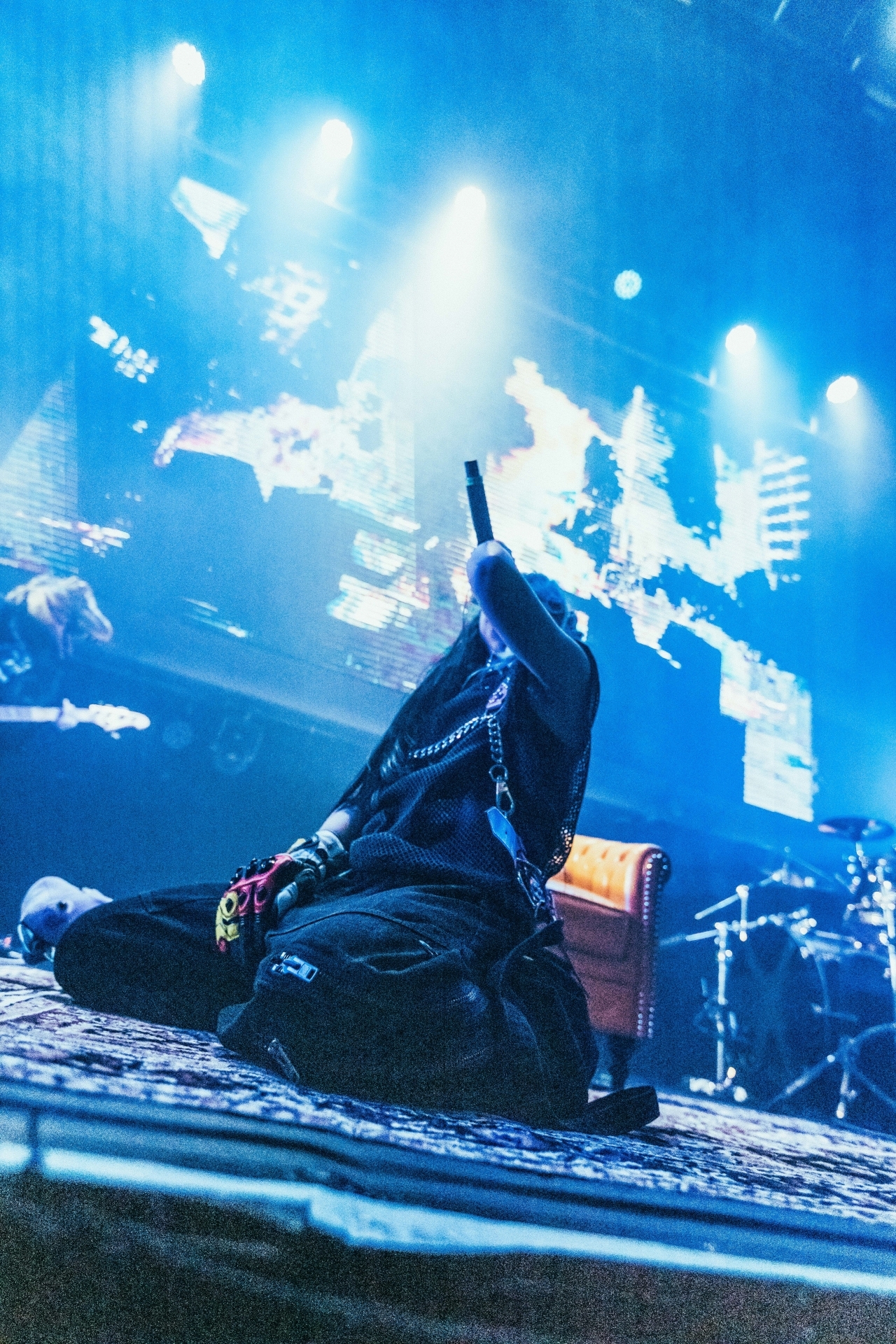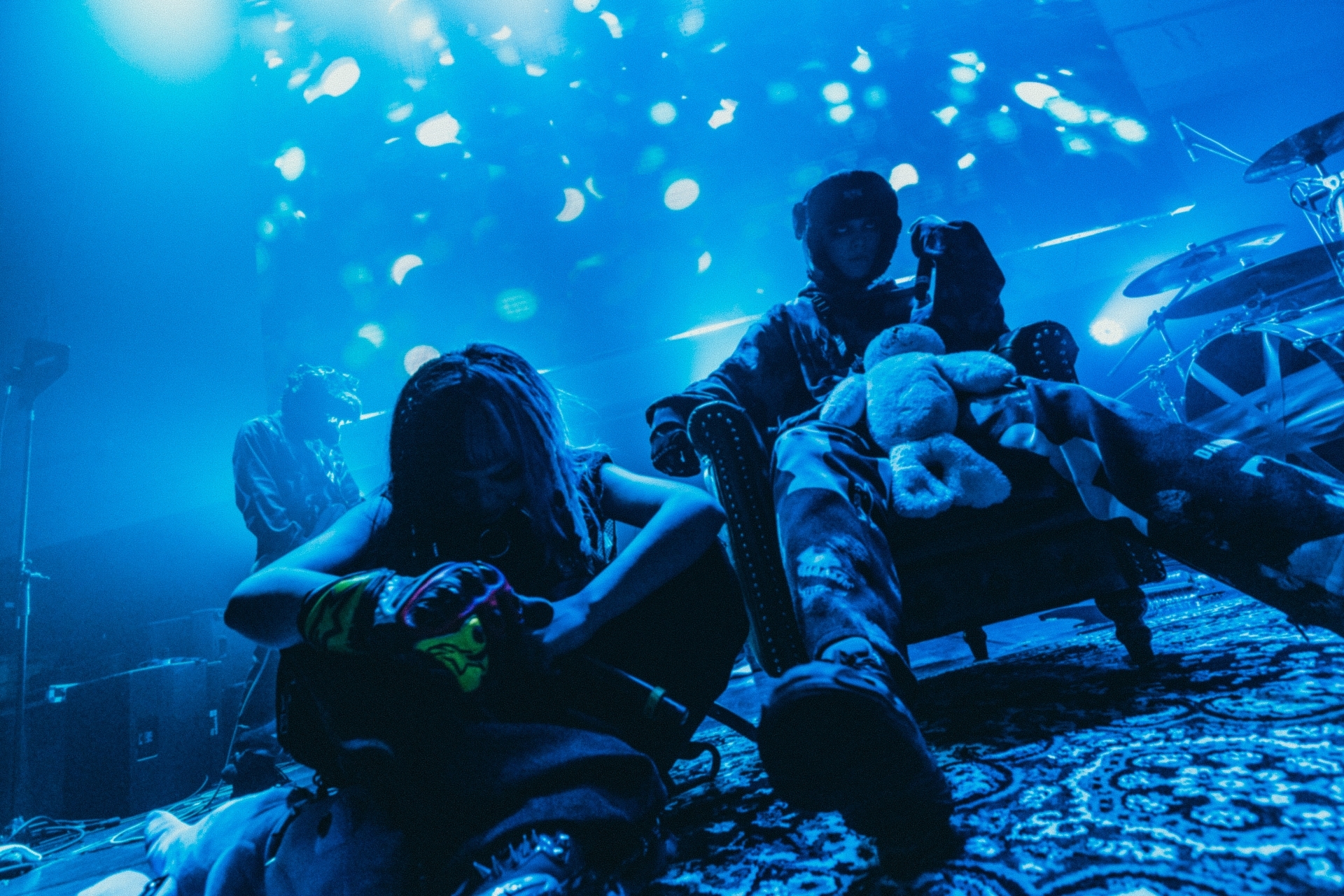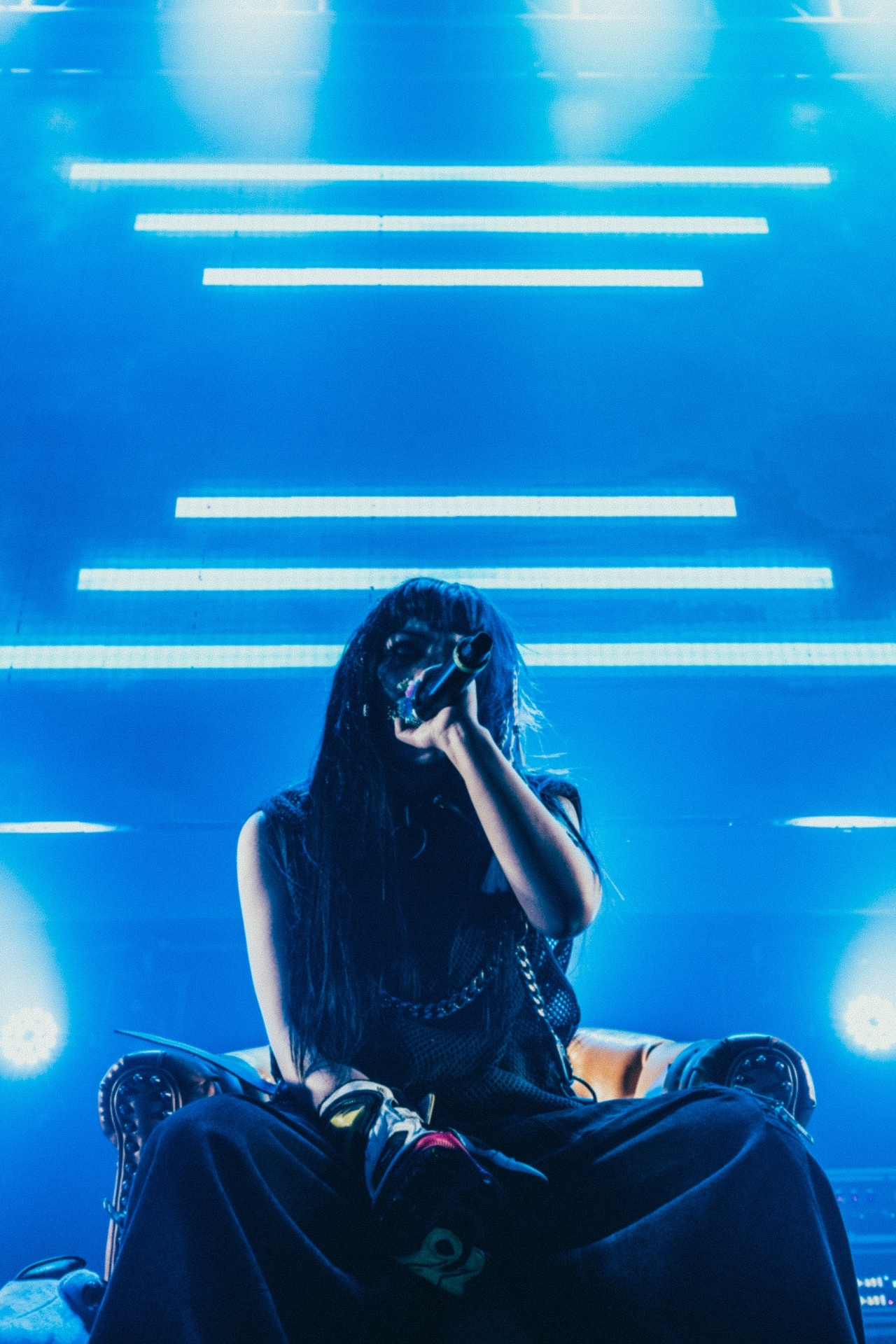 続く「tears in rain;(」では、作品ではフューチャリングアーティストとして参加しているCVLTEから、客演としてavielが登場。逃げ場のない感情に苛まれながら、それでも生きてる実感を抱かせる楽曲をツインボーカルで立体的に表現。押し迫るような歌と演奏が、グッと胸を締め付ける。星熊が男性ボーカルと並んで歌う姿も貴重だったし、二人の歌声の相性の良さも驚いたが。カーペットの上にぽつんとソファが置かれたステージセットや照明、衣装にメイクと星熊の脳内をそのまま具現化したようなステージに、登場したavielがハマりすぎていたことにも驚いた。突き上げるビートに野心を秘めた歌声を乗せ、音源とも異なる印象を与えた「ERA」と続くと、ライブはクライマックスへ。