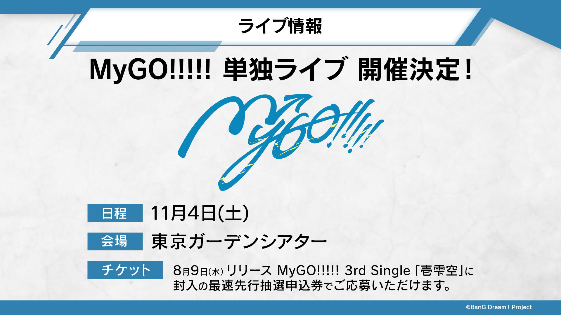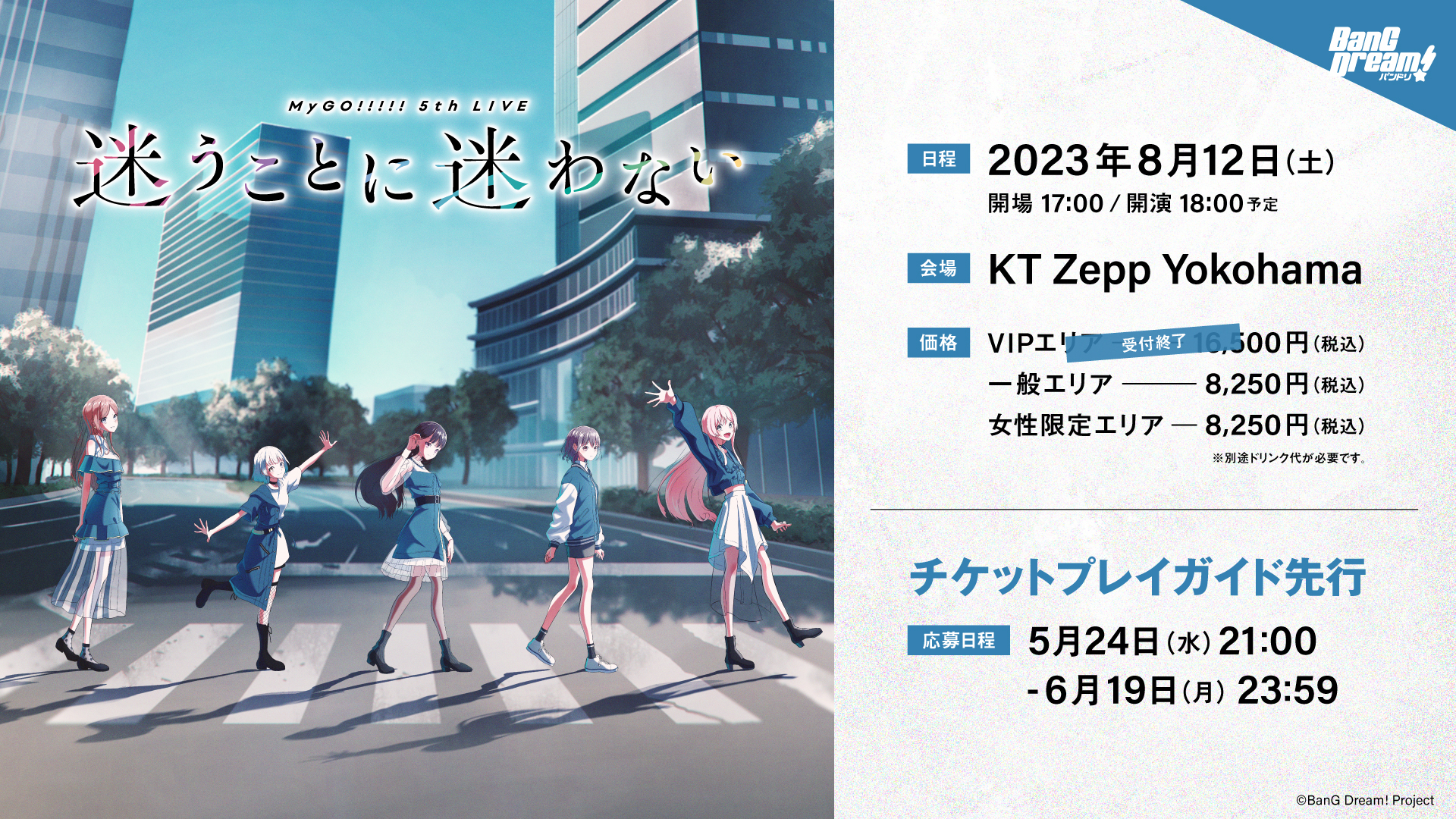 合わせて2023年8月12日(土)にKT Zepp Yokohamaで開催されるMyGO!!!!! 5th LIVE『迷うことに迷わない』の、ライブキービジュアルも公開。合わせて11月4日(土)に東京ガーデンシアターにて単独ライブが開催されることも発表された。本公演の最速先行抽選には、8月9日(水)リリースのシングル初回生産分に封入の申込券で応募出来る。ライブの詳細は今後の発表を待ちたい。