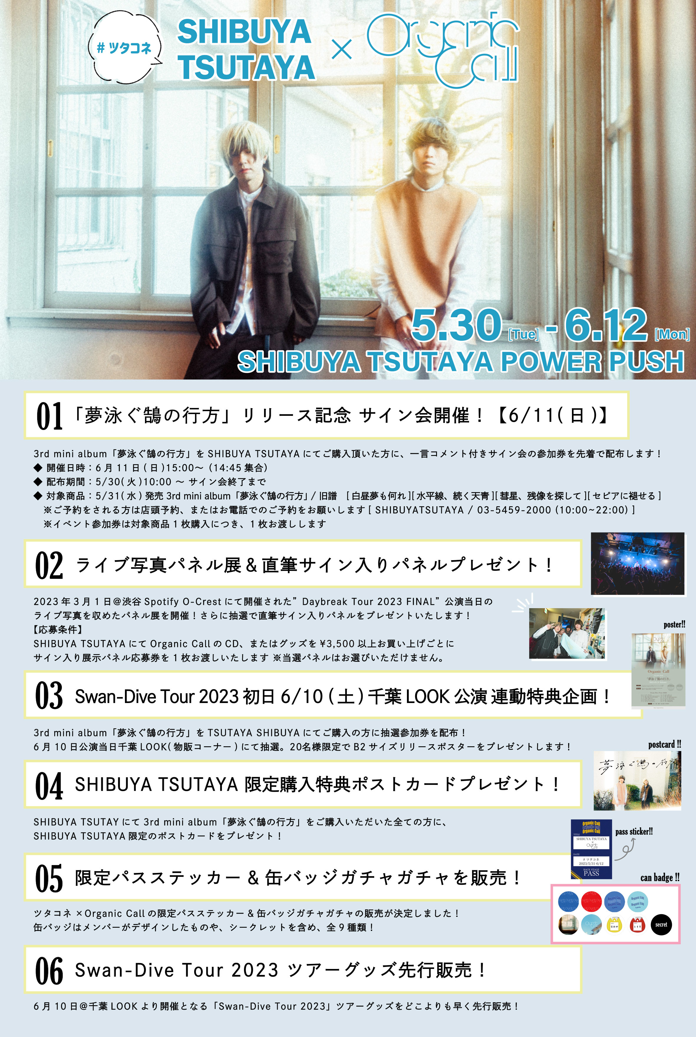 また、5月31日(水)~6月12日(月)の期間、TSUTAYA SHIBUYAにてOrganic Call × ツタコネ企画の開催が決定。ツタコネ限定特典やグッズ、6月10日(土)より開催となる『Swan-Dive Tour 2023』ツアーグッズの先行販売、ライブ写真パネル展など様々な企画が用意される。