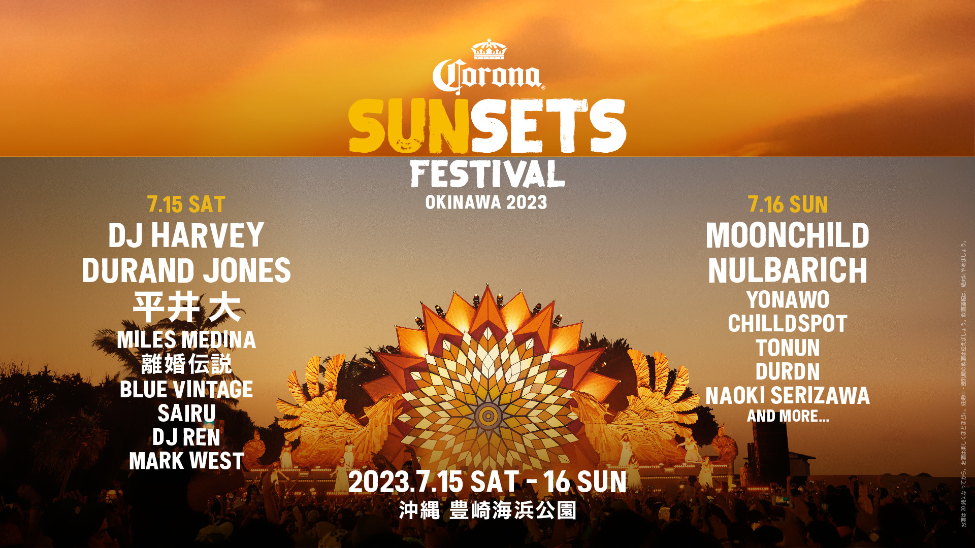 7月15日(土)、16日(日)に、沖縄・豊崎海浜公園にて開催される『CORONA SUNSETS FESTIVAL 2023』の最終発表で、DJ HARVEY、離婚伝説、Blue Vintage、tonun、DURDNの5組の出演が決定した。