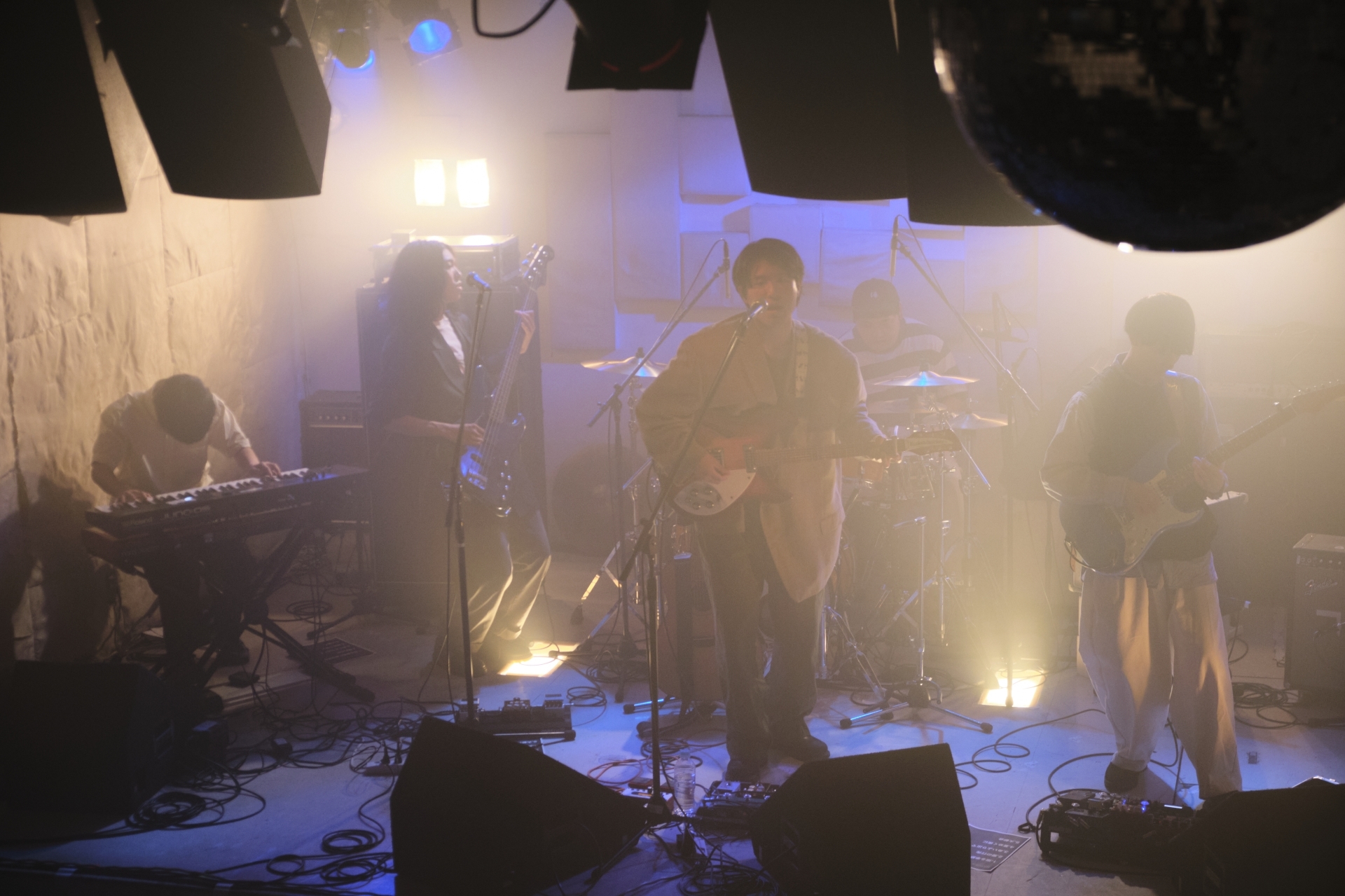 この日、トップバッターで登場したのは、東京を中心に活動する5人組ポップバンド、アロワナレコード。1曲目「巡る季節に身を任せ」のゆったりしっとりしたアコギの弾き語りでライブが始まると、夕焼け感あるどこか切ないサウンドに映える、藤井陸(Vo&Gt)の伸びやかなハイトーンが胸を締め付ける。「愛の行先」、「あいより出でて」と続き、心地よい丁寧な演奏に鍵盤のフレーズが情景を広げ、ソリッドなギターがフックを生んでと、聴きどころ満載のステージで魅せた彼ら。