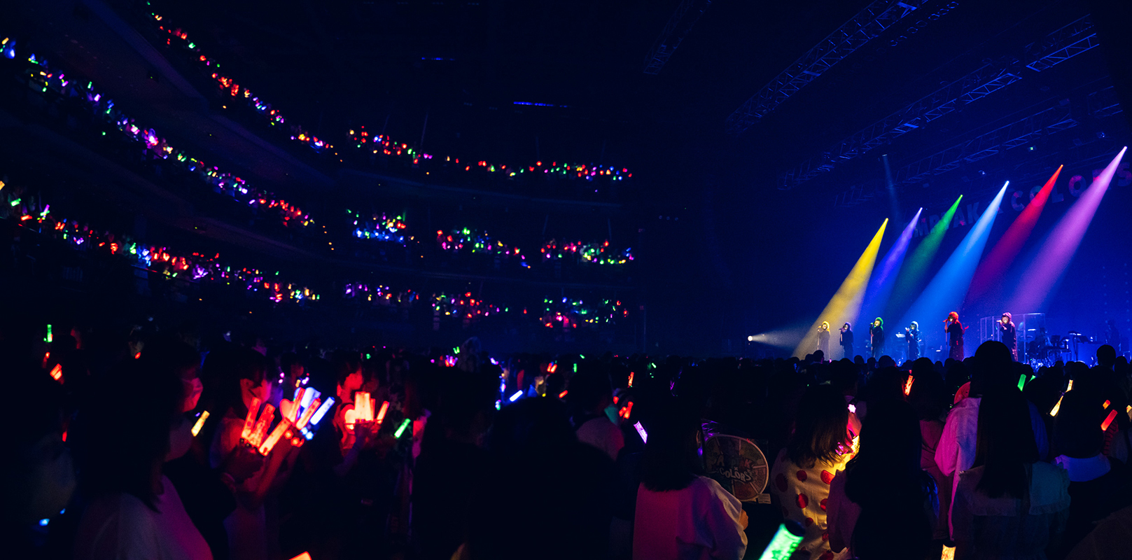 続く「RAINBOWxCOLORS」は、すとぷりのななもり。プロデュースによる1st配信限定EP『RAINBOWxCOLORS』に収録、すとぷりのるぅとが提供したタイトル曲。ラップありメンバーコールあり、歌詞そのままいきなり<有頂天>になれる最強のアッパーチューンは、あまりにもライブ映えする。メンバー6人とリスナーで織り成す虹色ときたら、なんて鮮やかなんだ。