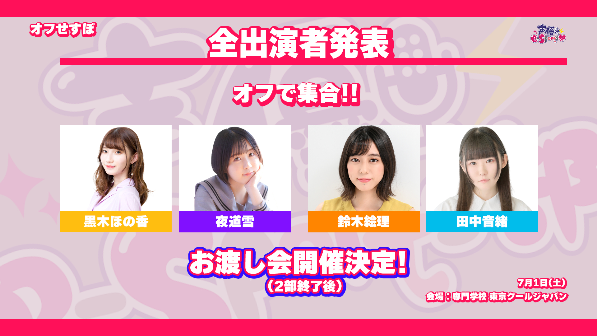 総勢29名のガチゲーマーの声優たちがゲーム・eスポーツを応援するプロジェクト「声優e-Sports部」の2023年、第2弾のオフラインイベント「オフせすぽ Vol.02」が 7月1日(土)に開催され、イベント初参加の黒木ほの香、夜道雪、鈴木絵理の3人と田中音緒が集結することが発表された。