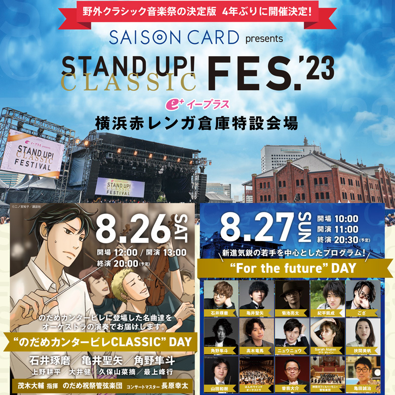2023年8月26日(土)・27日(日)に横浜赤レンガ倉庫特設会場にて開催される『SAISON CARD presents STAND UP! CLASSIC FESTIVAL’23』(通称:スタクラフェス)。チケット先着順先行がイープラスにて6月3日(土)12:00より販売開始となる。
