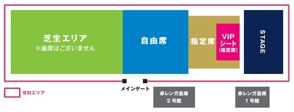 チケットは、「VIP指定席」「指定席」「自由席」(以上、座席あり)、「芝生エリア」(大人/小人・座席なし)の4座種・5券種。「VIP指定席」は最前方中央エリア指定席で、専用休憩エリアや専用お手洗い、充電スポットの提供といった特典つき(※8月27日(日)分のVIP指定席は完売)。各種チケットのイープラス先着先行販売は6月3日(土)昼12:00よりスタート。