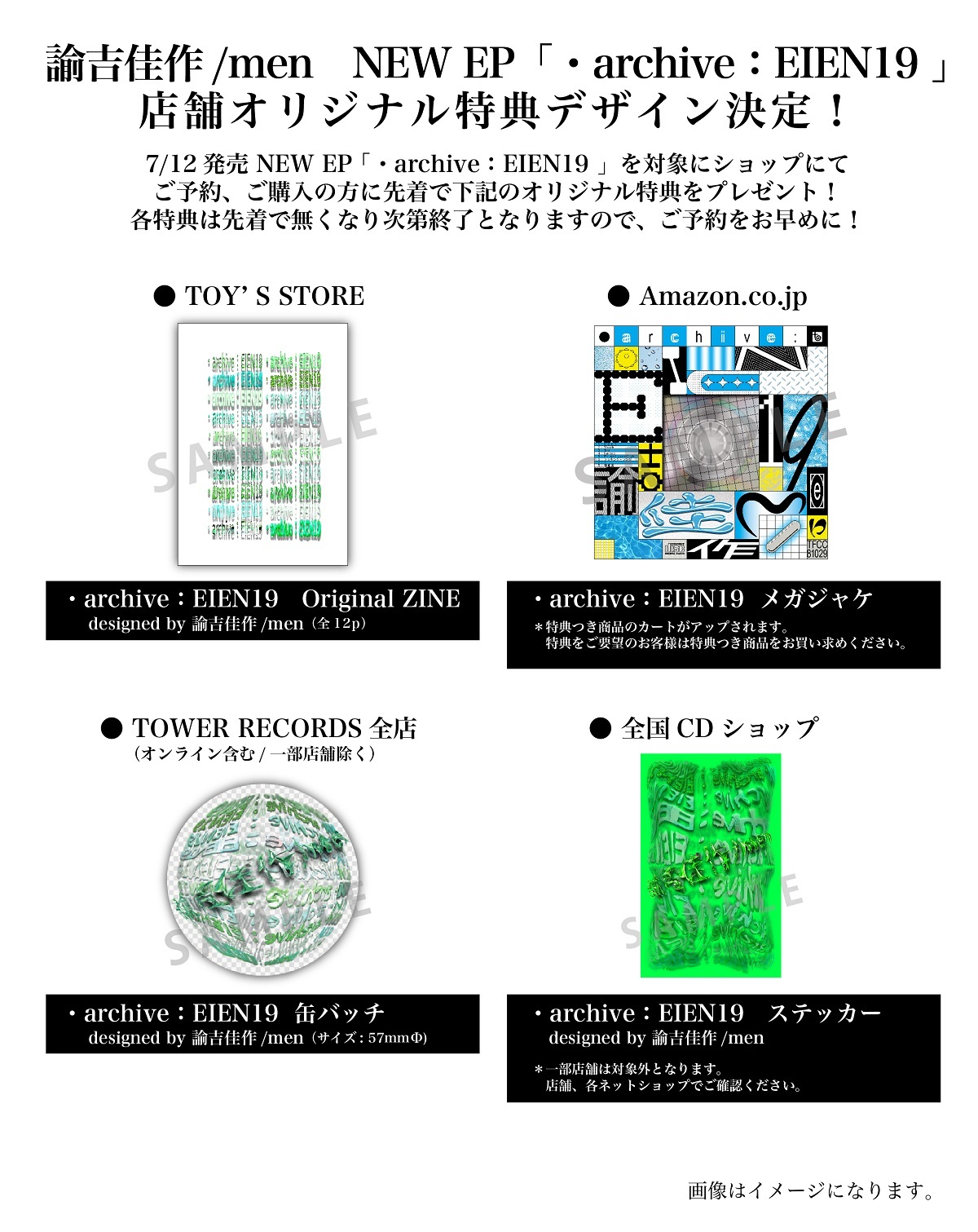 また、店頭特典も公開された。缶バッジ、ZINE、ステッカーは諭吉佳作/men自らがデザインしたものになっている。詳しい情報はオフィシャルHPをチェックしてほしい。