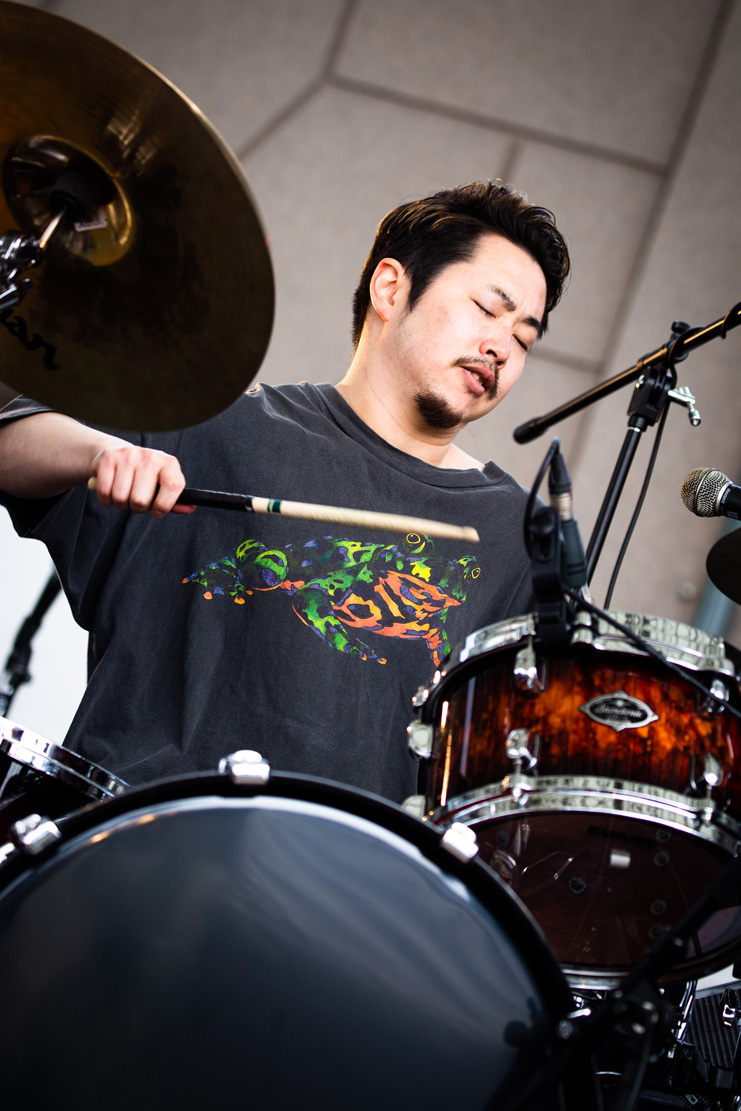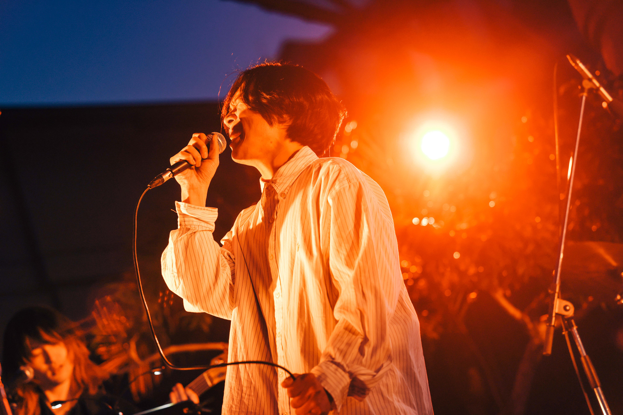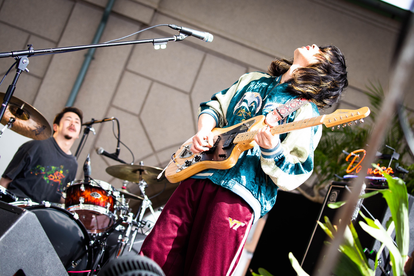 さかしたの歌が野外にたゆたいに伸びていった「あたしぐらいは」、サイケなインスト「ばける」から「化けよ」でフロアを覚醒させるかのように激しくプレイするシーンで圧倒。イントロで歓声が起こった「ペーパーロールスター」ではシャウト。バキバキの演奏で魅せる、ライブならではのアレンジ。血のたぎるステージングで、震えるような興奮と余韻を残していった。