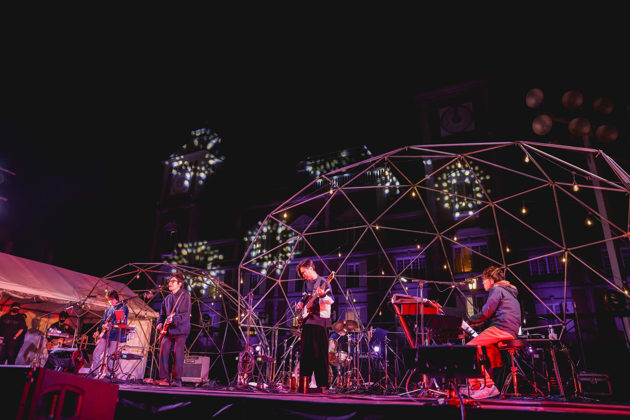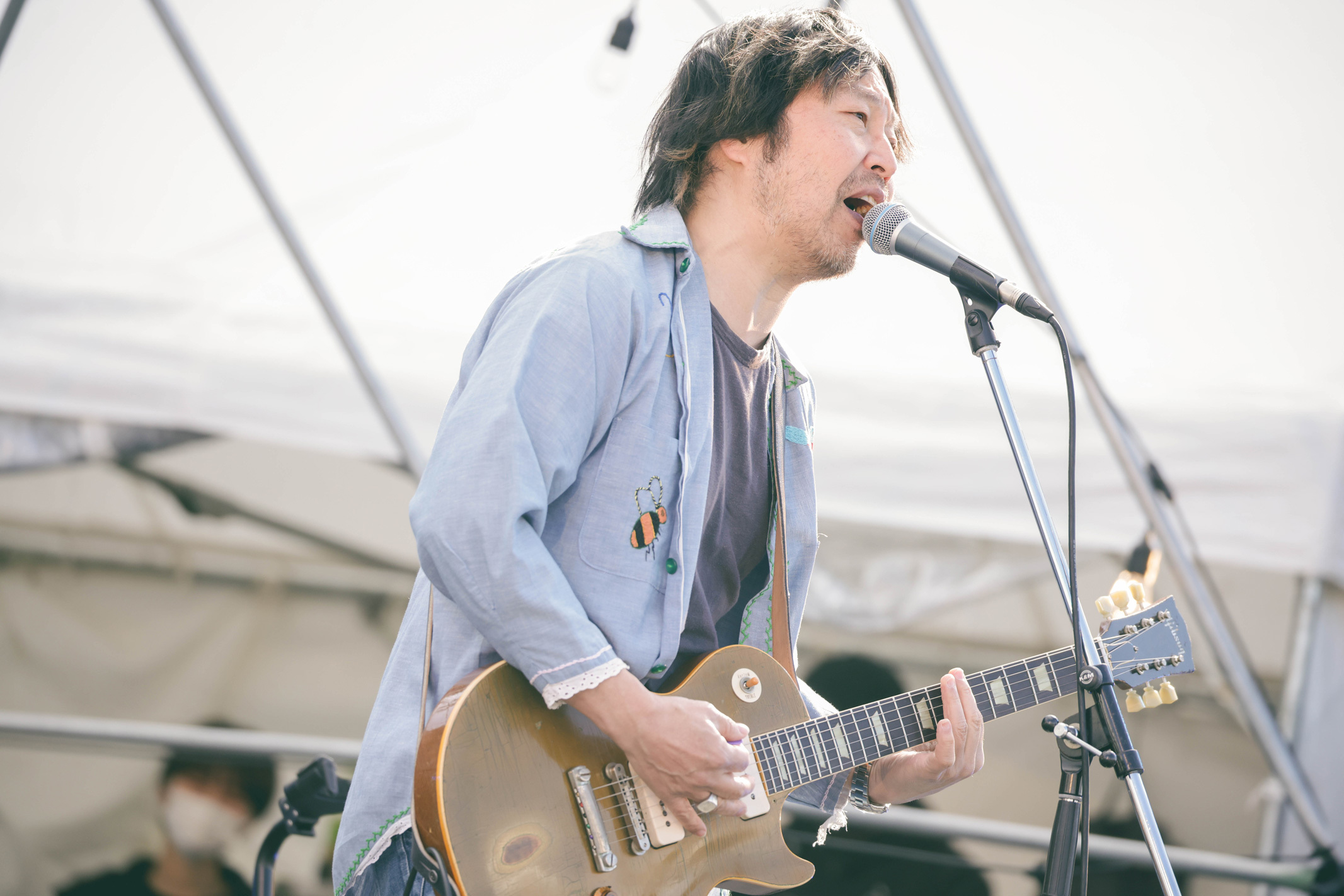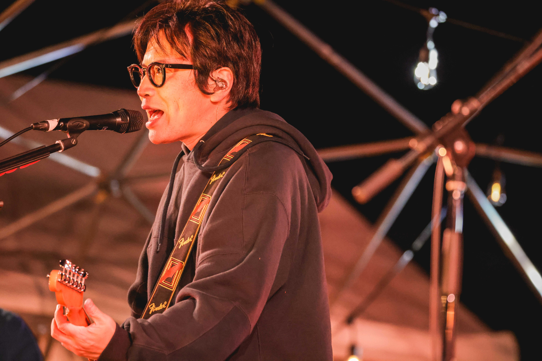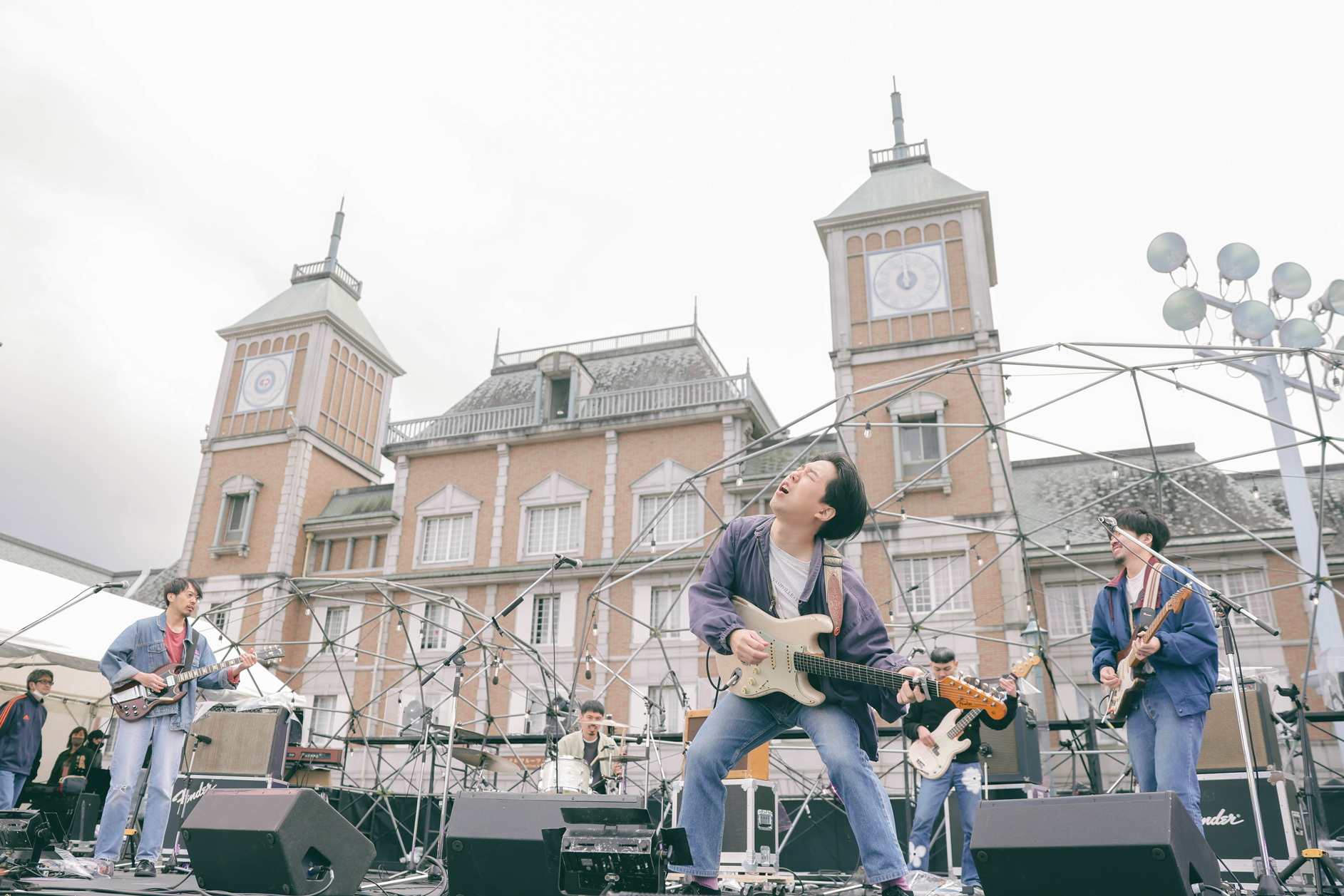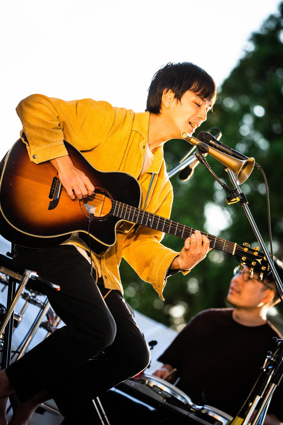 ふと足元に目をやると、トクマルは日も暮れ始めた北神戸の山間はそこそこ肌寒いのに、しっかりと裸足だったトクマルシューゴ。神戸の地を踏みしめ風土を感じながら、音を作り、歌に変えているのだろうかと思うほど、この場所、この瞬間にぴったりな祝祭感あふれるステージ。「PARACHUTE」では子どもたちも合唱、「最近、西陽が苦手で……」というまったりMCからアニメ「ちいかわ」のテーマを鳴らす、トクマルの人柄と音楽がつくる心温まるシーンの連続に会場は笑顔でいっぱいに。