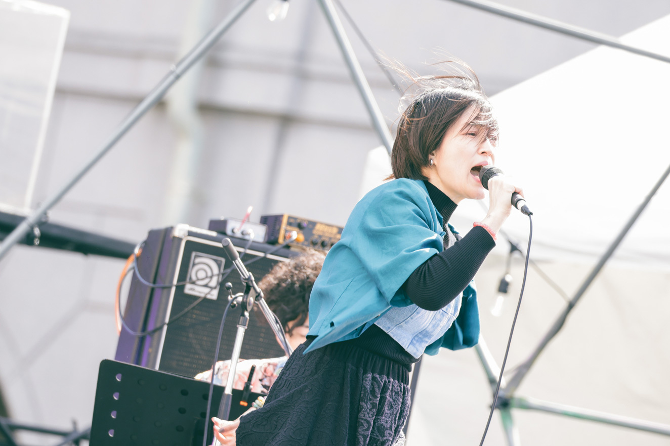 椅子に座り、ピアノの伴奏で荒井由実のカバー「翳りゆく部屋」をしっとりと響かせた安藤裕子。「All the little things」「UtU」では椅子に座ったまま上半身を大きく揺らし、魂を込めた歌声で観客を圧倒する。MCでは「風がすごくて(笑)。髪の毛セットした意味がないねえ」と寒そうに手を擦り合わせつつ、「この間、久しぶりに生まれ育った家に行きまして、小さい頃通った道のりを思い出して作った曲があるので、大人になった人は昔のことを、子どもは今の気持ちを聞いていただけたらと」と郷愁たっぷりの未発表曲「Family ties」を初披露。美しい歌声が青空に溶けてゆく。彼女の凛とした佇まいと母性は見る者を虜にする存在感を放っていた。