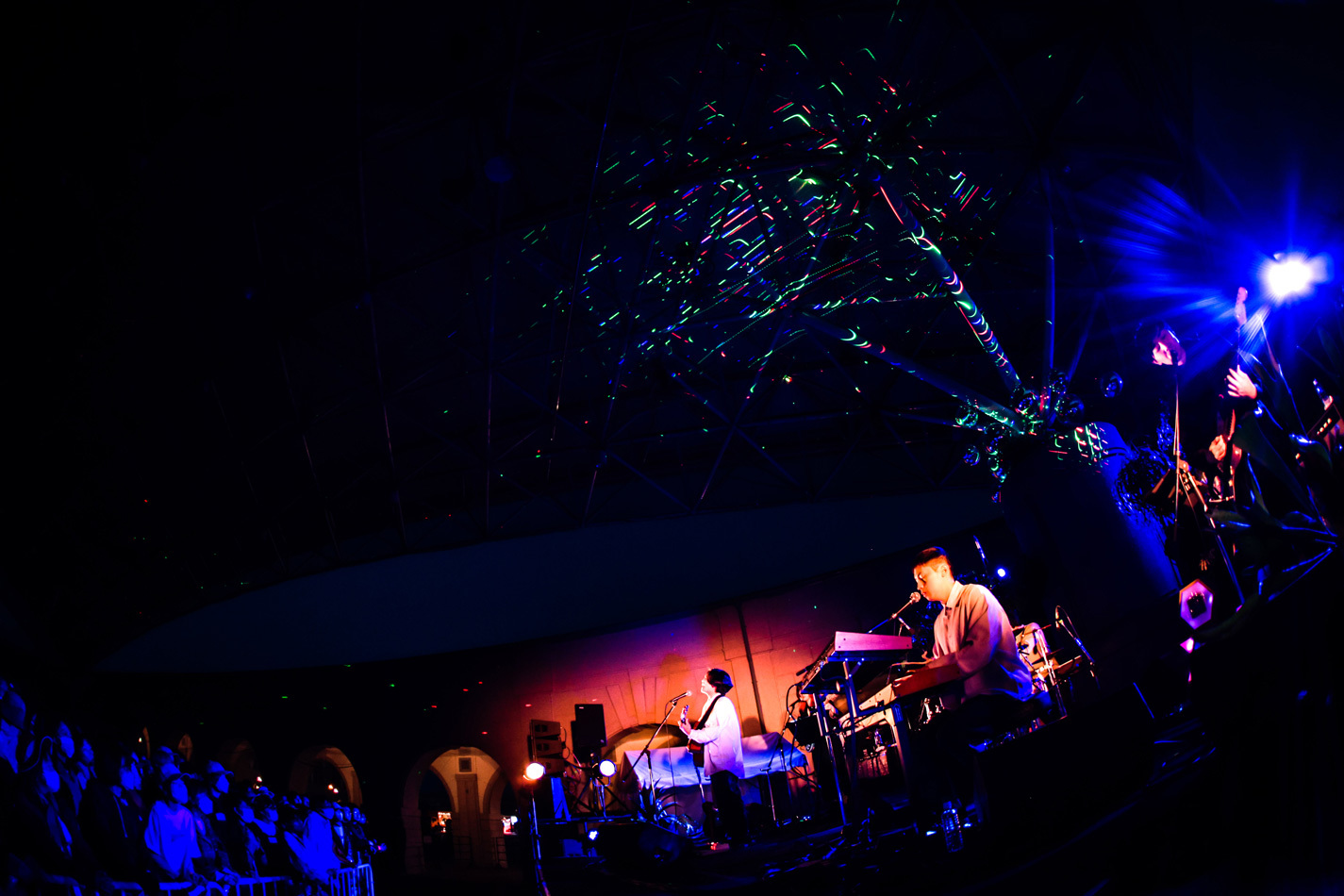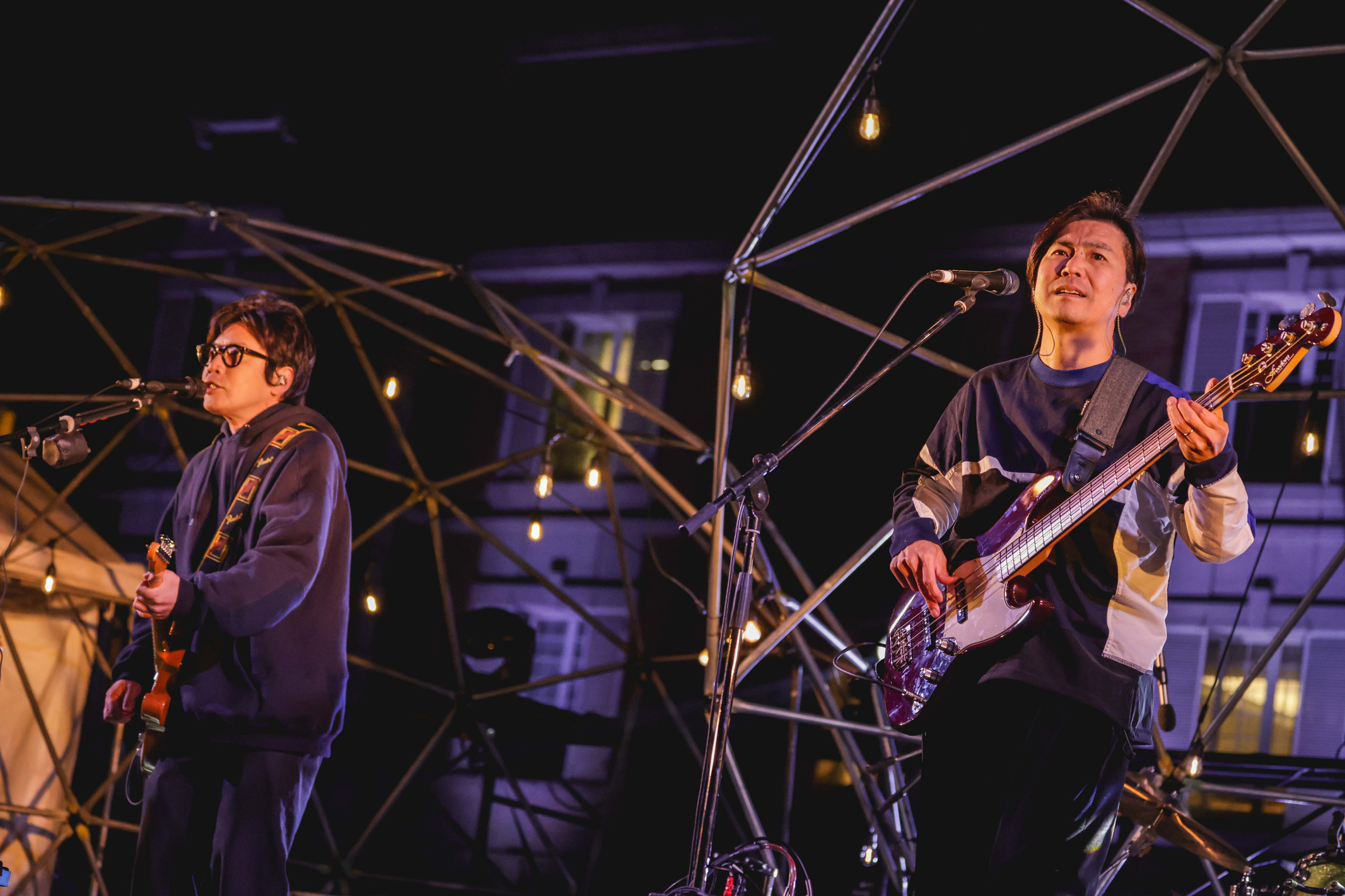 FRUITS STAGEのトリを飾るのは、プレイベントではオープニングアクトとして出演していたBialystocks。すっかり日がくれて、ヅカデンが手がけた電飾がより鮮やかにステージを彩る。この日も甫木元空(Vo.Gt)と菊池剛 (Key)、そしてサポートに西田修大(Gt)、Yuki Atori(Ba)、小山田和正(Dr)を迎えたバンド編成で登場。菊池の鍵盤から、「差し色」でライブをスタート。