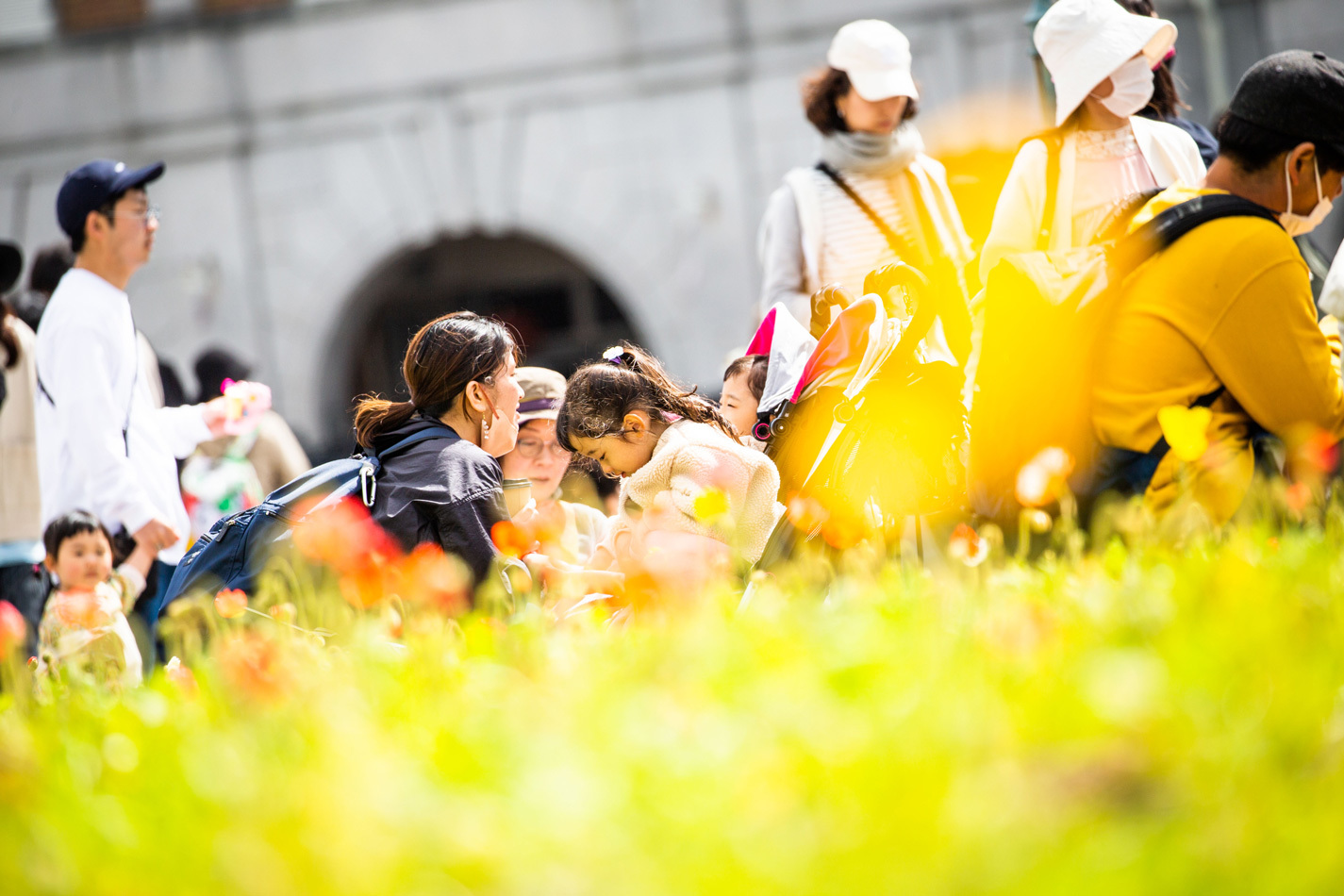 朝10時前。神戸フルーツ・フラワーパーク 大沢前には、大勢の人々が行列をなしていた。花壇に咲いた色とりどりのチューリップが目にも鮮やかだ。少し寒さを感じるものの天気は良好。最高のフェス日和となった。