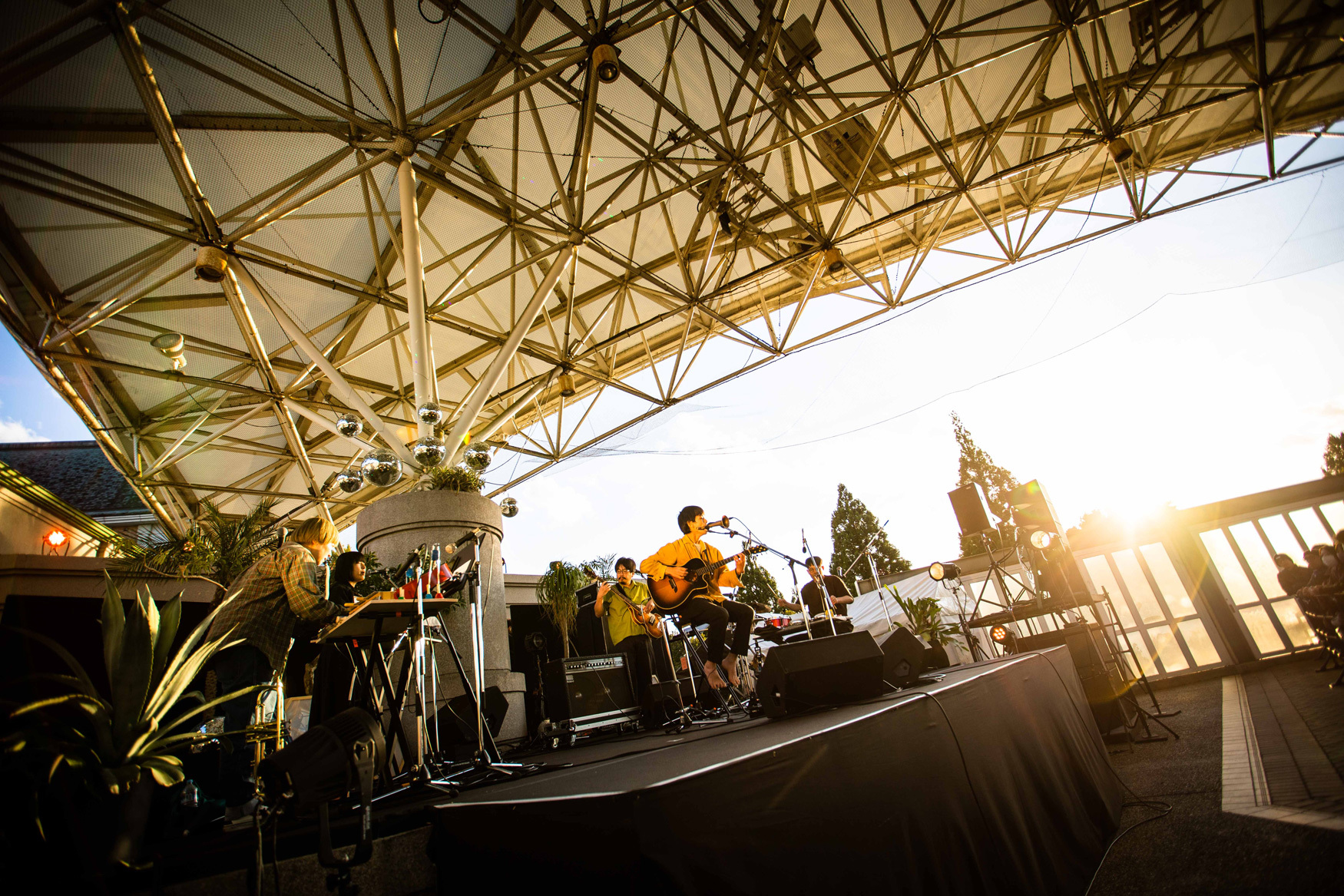 オランダの国立美術館を模した、お城のような外観の「神戸ホテル フルーツ・フラワー」の前に作られたのがFLOWER STAGE。その向かいにあるイベント広場にFRUITS STAGEが作られた。FLOWER STAGEは建築集団・々(ノマ)が、FRUITS STAGEは電子工作グループ・ヅカデン(宝塚電子倶楽部)がステージの装飾を手がけている。フルーツ・フラワーパークの風景とイベントのコンセプトにピッタリなステージで、フードなどの出店も含めて、初開催のフェスを成功させようとみんなで力を合わせて手作りしているところからも、お祭り的な一体感が生まれていたように思う。