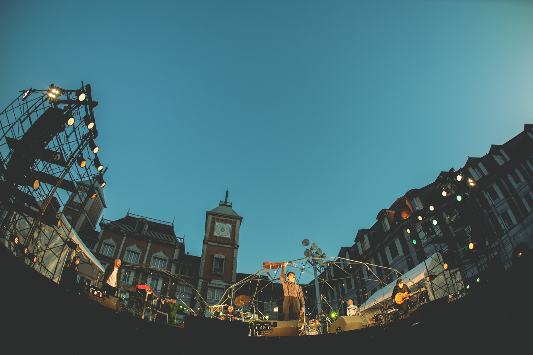 夕暮れ時のFRUITS STAGEには、ドラムにベース、トランペットにアコーディオンと、それから見たことがない楽器がたくさん並んでいる。どんなライブが繰り広げられるのかと、ざわざわしているところにバンドメンバーと登場したトクマルシューゴ。「Katachi」から重なり合う音がとても楽しげで、だけど野外の広いステージもなんのそのと飲み込んでいくようなスケール感は凄みがある。