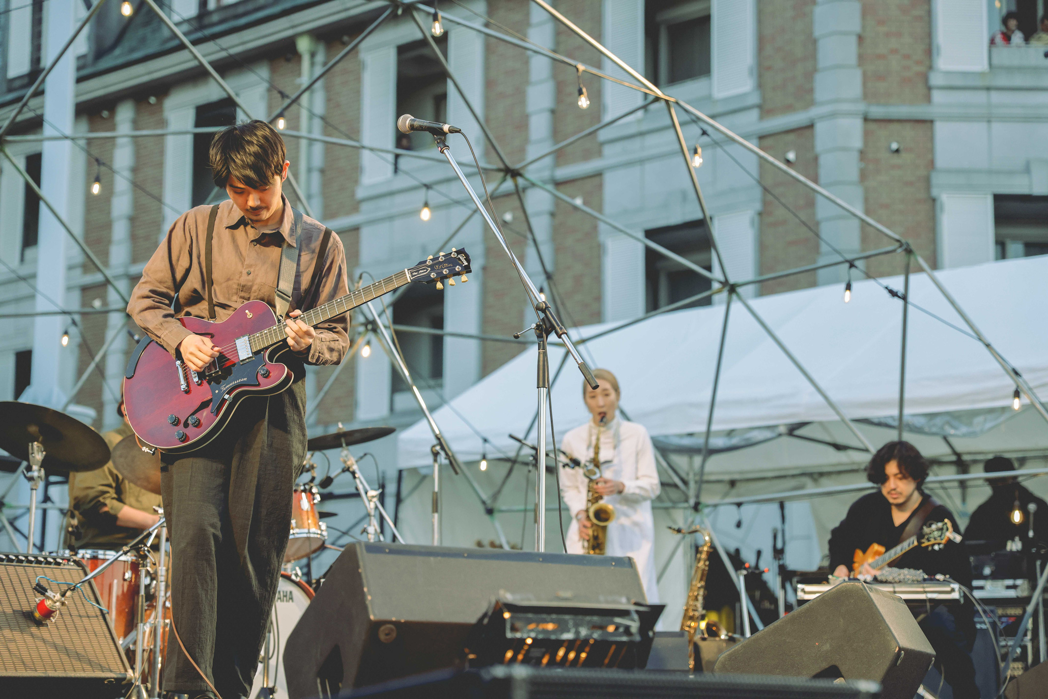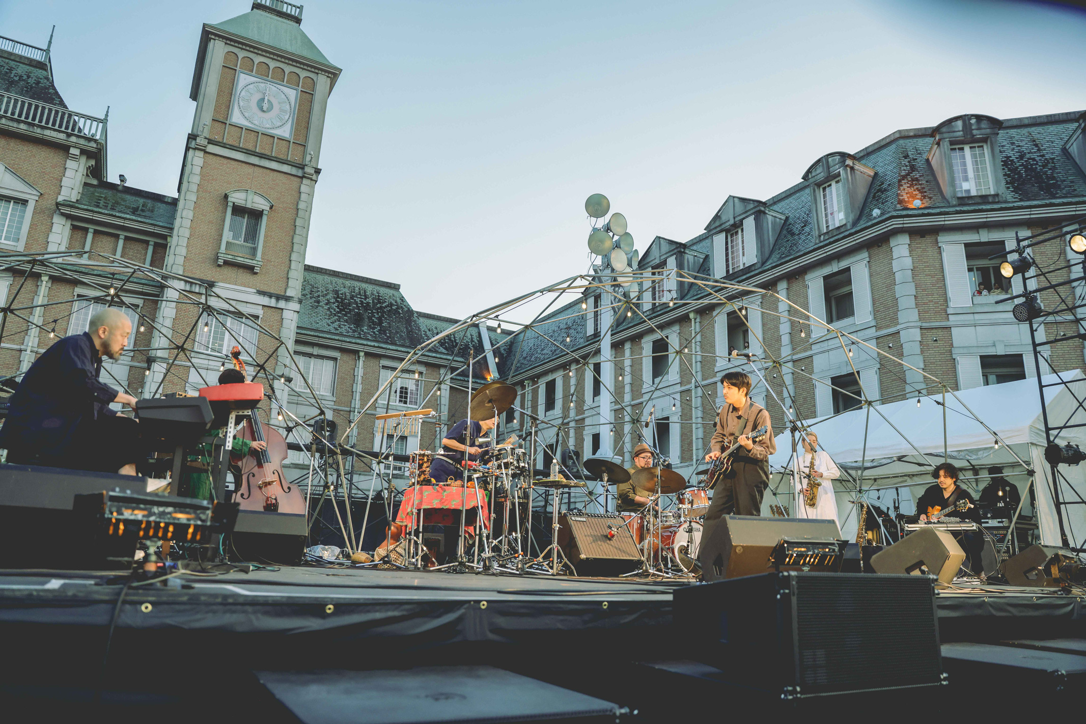 続くFRUITS STAGEは、浦上想起・バンド・ソサエティ。多重録音 音楽家・浦上想起がキーボード&ボーカルで、平陸(Dr)、しょけん(Gt)、松丸契(Sax)と共に登場。この日が、野外フェスでのライブは初となる。1曲目「新映画天国」から緻密かつ遊び心あふれる、美しいバンドサウンドに身を委ねて踊る観客たち。「芸術と治療」ではより軽快に奏で、ヴォコーダーで声を変え挨拶するなど、全身で音を楽しむようなステージングに心が踊る。「遠ざかる犬」からはよりじっくりと聴かせる展開に。「未熟な夜想」「金星の呼気」と聴き耽けっているうちに、未発表の新曲を披露しあっという間にラストを迎えた。音源とはまた違った熱量とフィジカルをともなった貴重なライブ体験に。その感動を表すように、ステージをあとにするメンバーには惜しみない拍手が送られた。