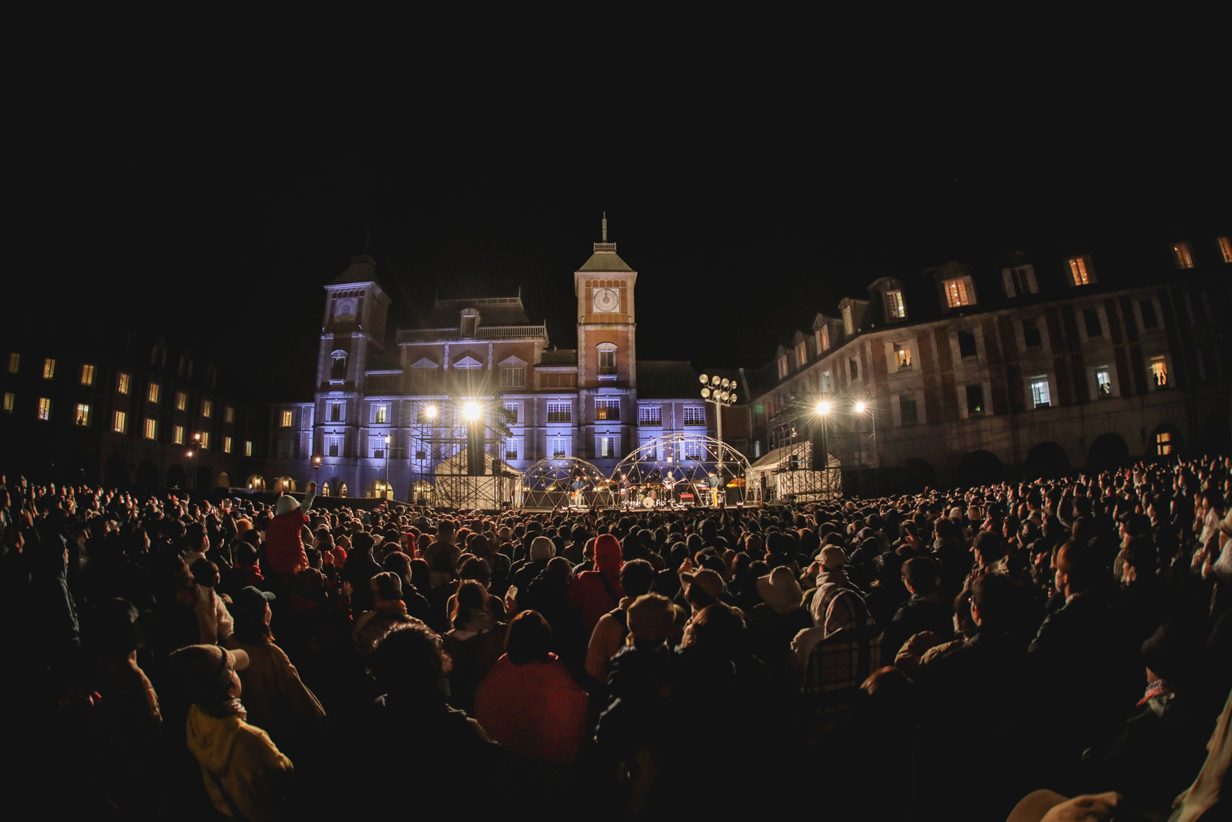 大トリをつとめたのはくるり。完全に陽が落ち、もはや真冬並みの寒さとなっていたが、ステージ前は最後まで残った観客でぎゅうぎゅうだった。ステージの照明が落ちると歓声が上がり、夜空に天然の星空が浮かび上がる。まさに星空の下のライブだ。サポートの野崎泰弘(Key)、松本大樹(Gt)、あらきゆうこ(Dr)に続いて岸田繁(Vo.Gt)と佐藤征史(Ba.Vo)が登場すると大きな拍手が贈られる。「琥珀色の街、上海蟹の朝」から「ばらの花」「愛の太場」「Superstar」と連発するアンセムに会場は大歓喜。