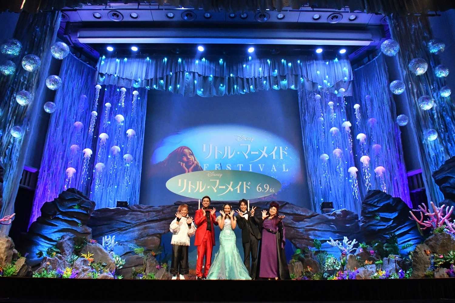 映画『リトル・マーメイド』公開記念“リトル・マーメイド”フェスは、本作の日本語吹替声優陣が一同に集結し、劇中のミュージカルナンバーを歌唱するイベント。海中のように美しく彩られた会場には、カラフルなペンライトを持った観客たちが詰めかけていた。そんな中、アリエル役のハリー・ベイリーからのサプライズメッセージ映像とともに、イベントは華々しく幕を開ける。