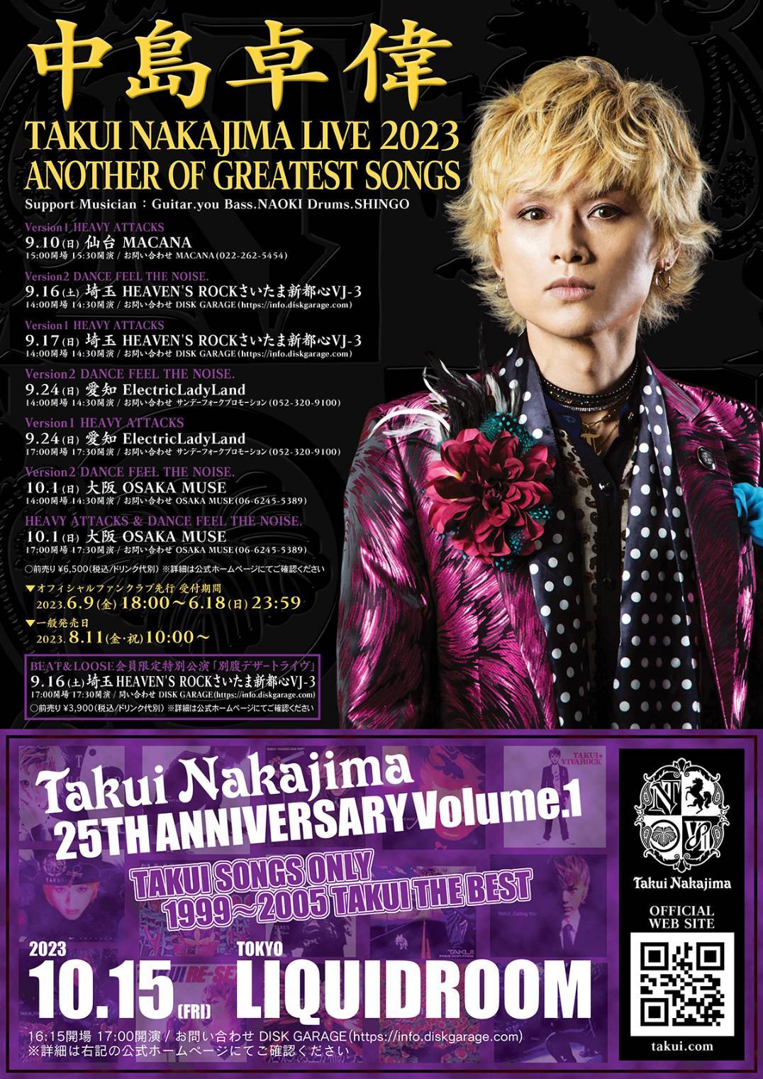 さらに、ツアー最終日となる10月15日(日)は『TAKUI NAKAJIMA 25TH ANNIVERSARY Volume.1TAKUI SONGS ONLY 1999〜2005 TAKUI THE BEST』と題したデビュー25周年イヤーの幕開けとなる特別公演となる。