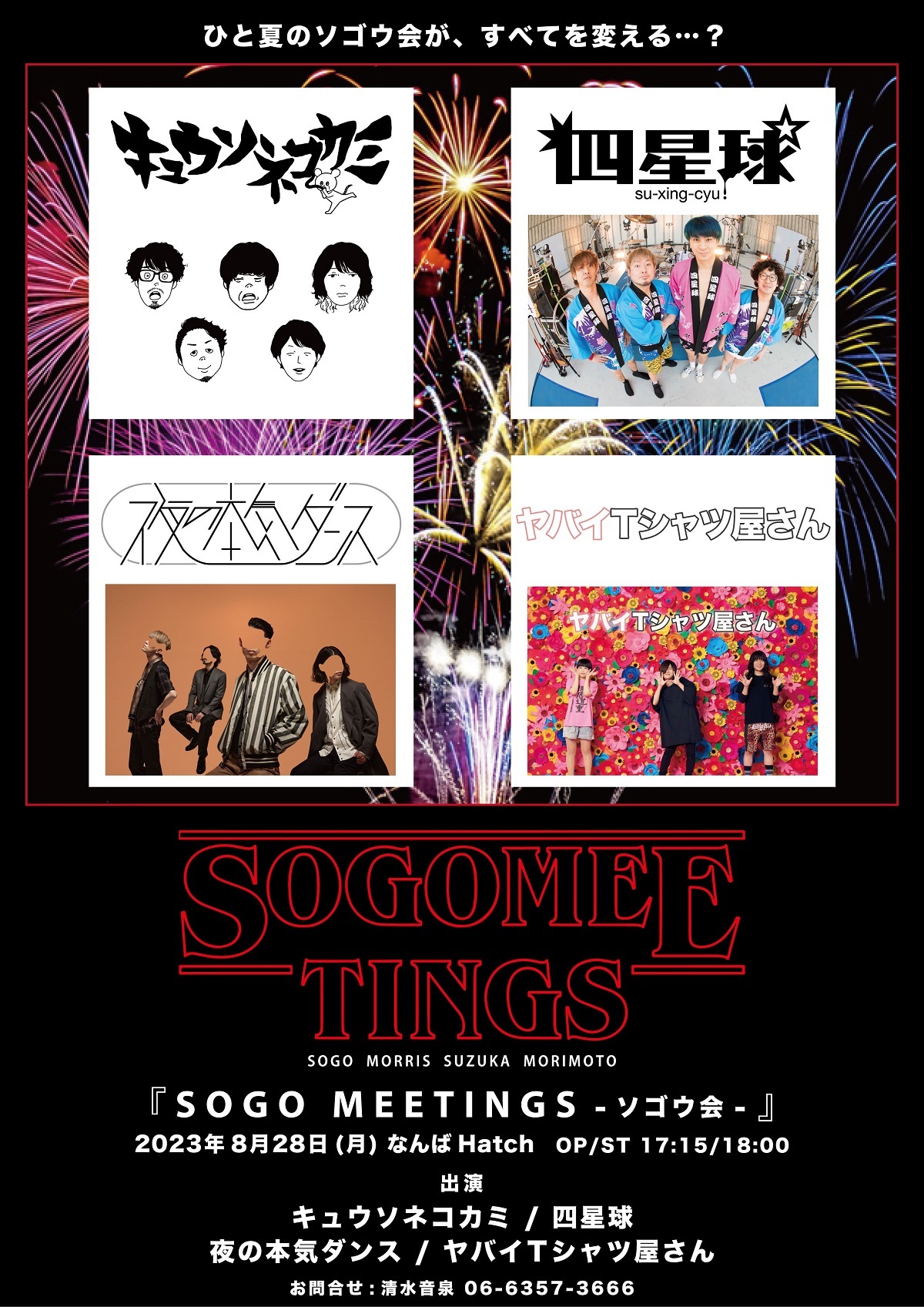 ソゴウタイスケ(キュウソネコカミ)、モリス(四星球)、鈴鹿秋斗(夜の本気ダンス)、もりもりもと(ヤバイTシャツ屋さん)のドラマー4名による「ソゴウ会」が、初の主催イベント『SOGO MEETINGS -ソゴウ会-』を、8月28日(月)大阪・なんばHatchにて開催することが決定した。