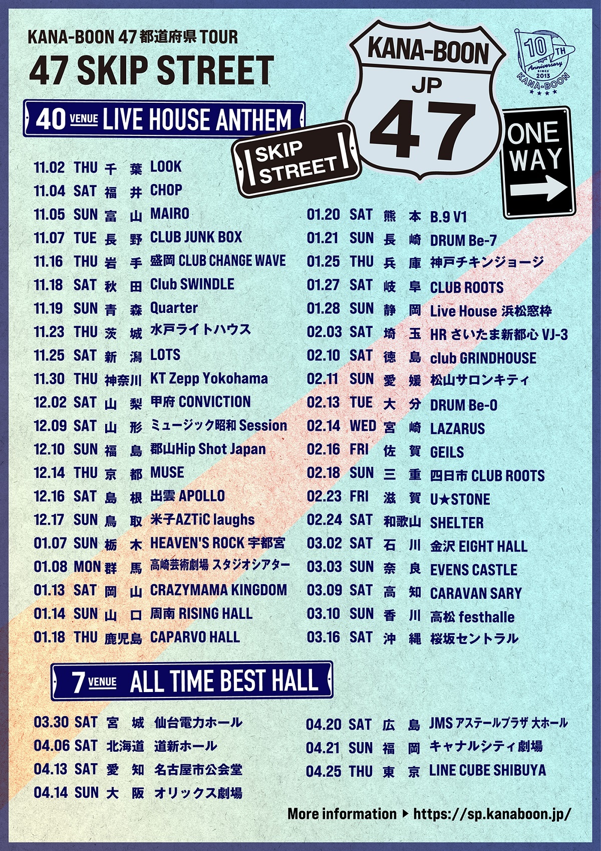 KANA-BOONが2023年11月から2024年4月にかけて、『KANA-BOON 47都道府県TOUR " 47 SKIP STREET " – LIVE HOUSE ANTHEM – 』、『KANA-BOON 47都道府県TOUR " 47 SKIP STREET " – ALL TIME BEST HALL – 』を開催することを発表した。