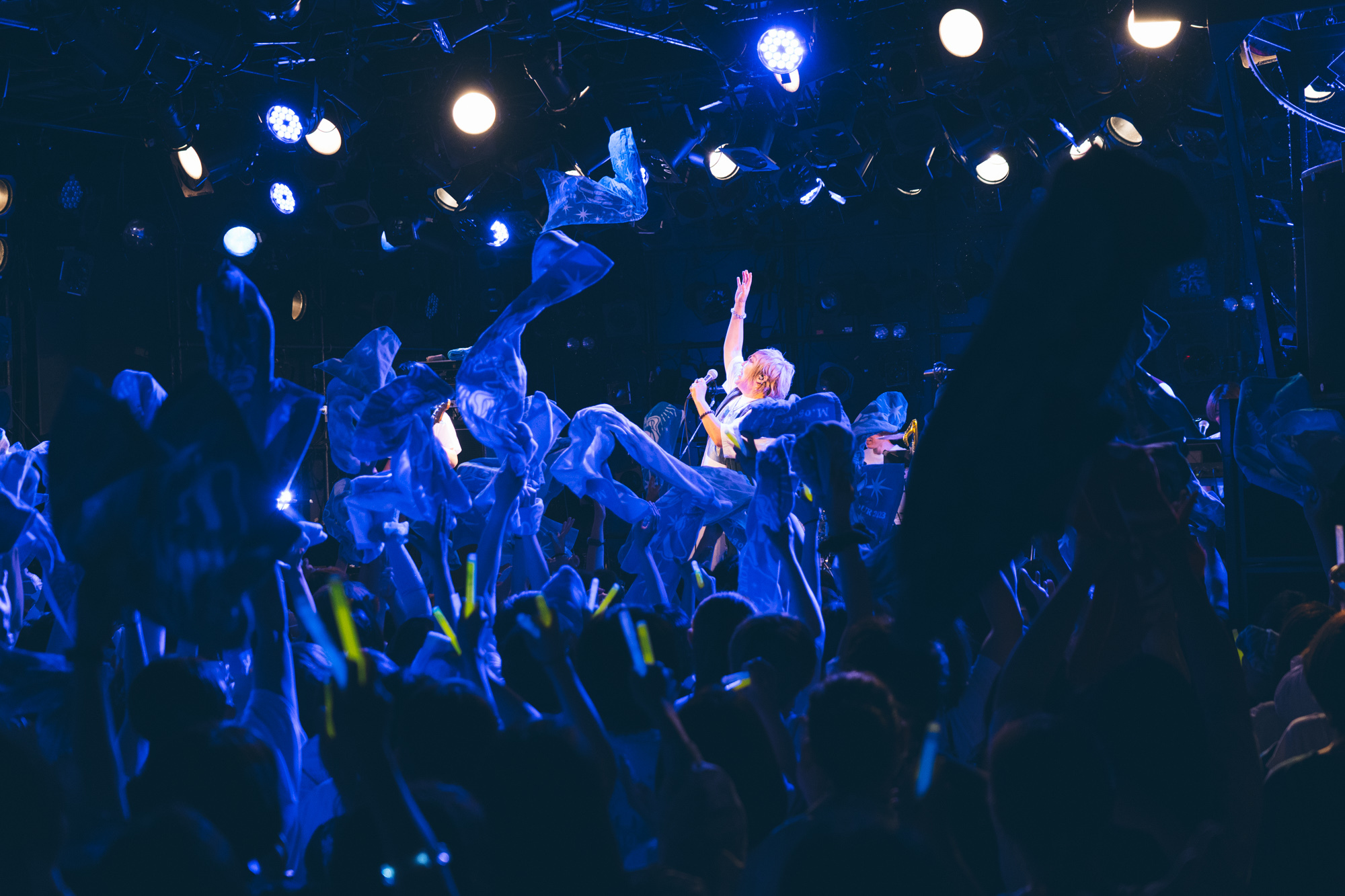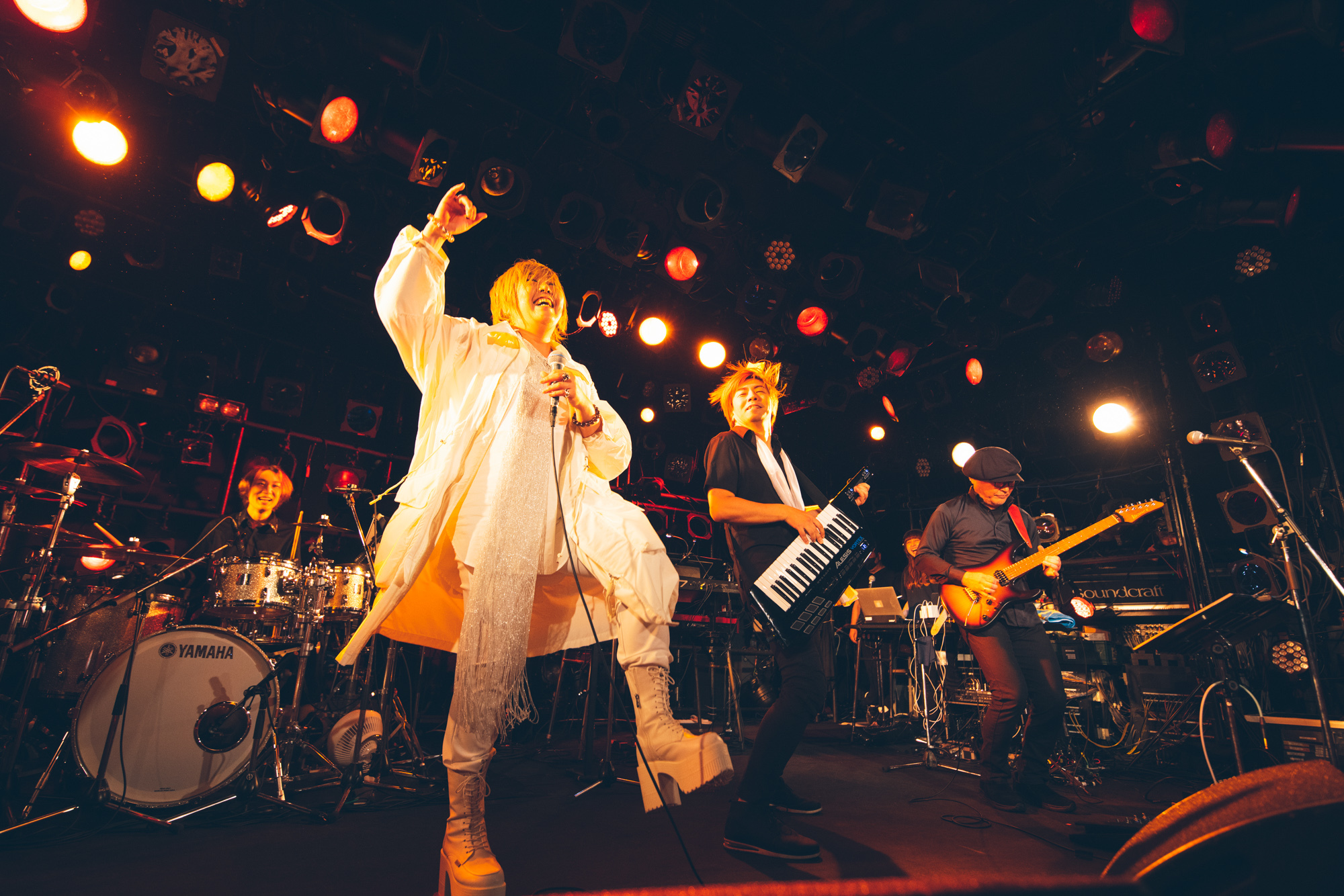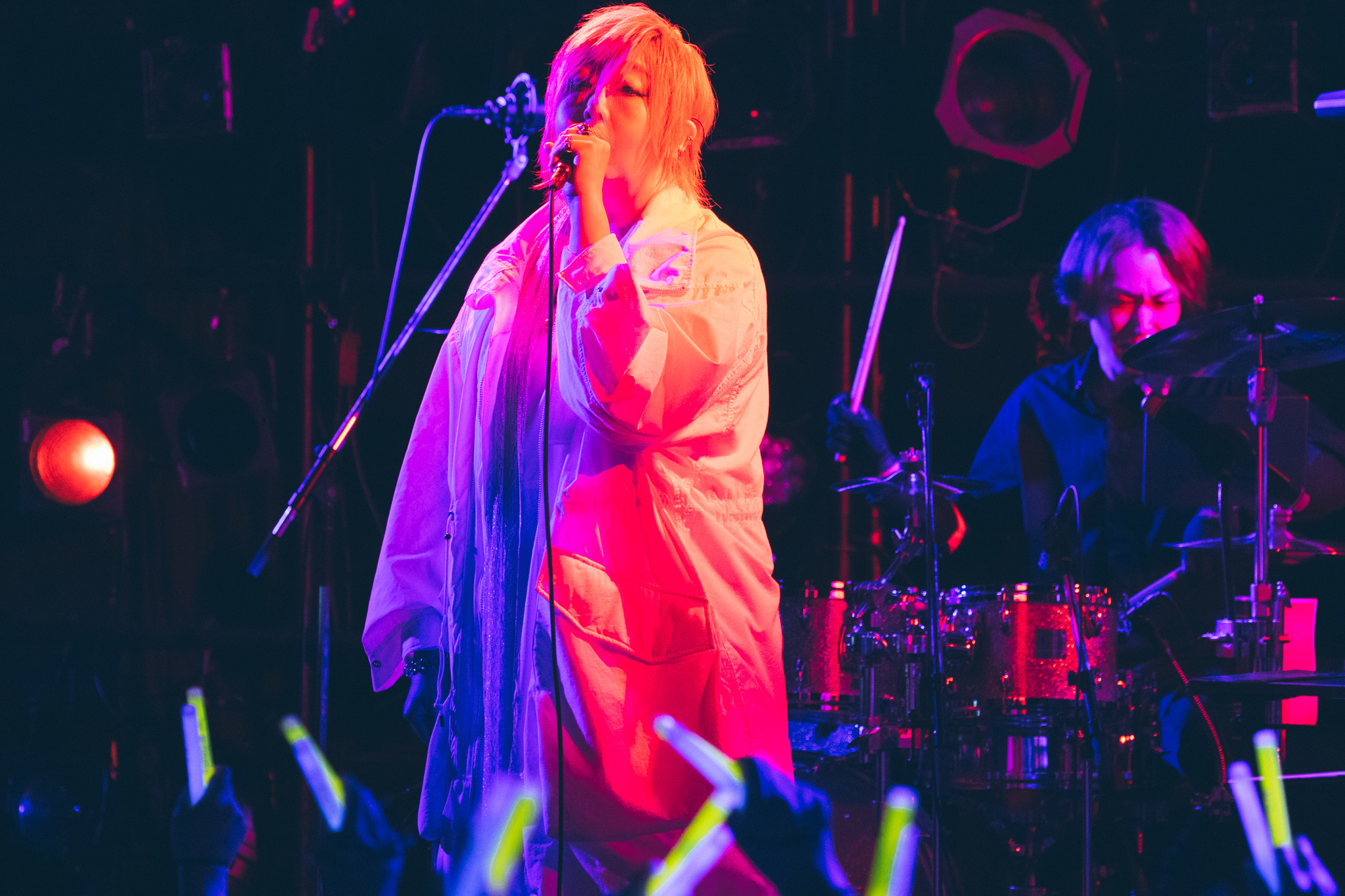 オープニングはどちらも重低音のサウンドがフロアを揺るがすような「聖者の行進」「絶望性:ヒーロー治療薬」というロックナンバーの二連発でスタート。迫力満点の生演奏に負けない低音ボーカルで、絶望の世界から立ち上がるメッセージが込められた二曲を力強く歌い上げ、最後はパワフルなシャウトで締めくくった。