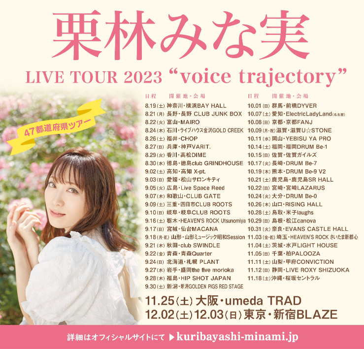 また、全国47都道府県ツアー『栗林みな実LIVE TOUR 2023 “voice trajectory”』の東京・大阪公演がバンド編成で行われることも発表されている。