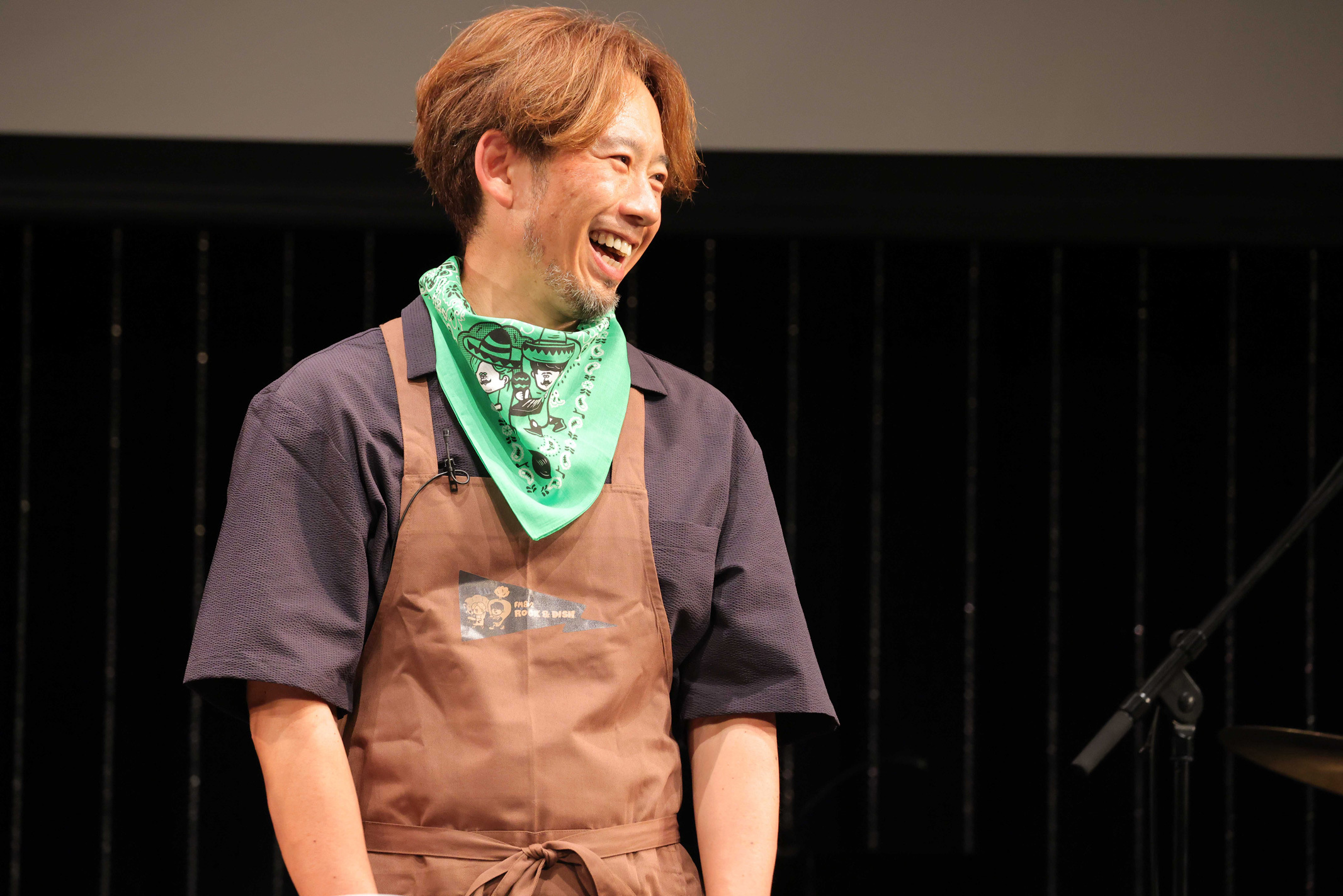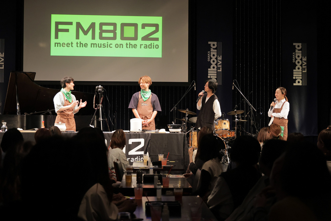 進行兼実況役のFM802 DJ・加藤真樹子が「みなさん、お腹すかしてきましたかー!?」と挨拶。早速、部長の伊地知と副部長の金澤を呼び込むと、お揃いのエプロン姿で登場したふたりは、規模を拡大したゴージャズな会場とお客さんの近さに「うわー!」と驚きの声をあげる。