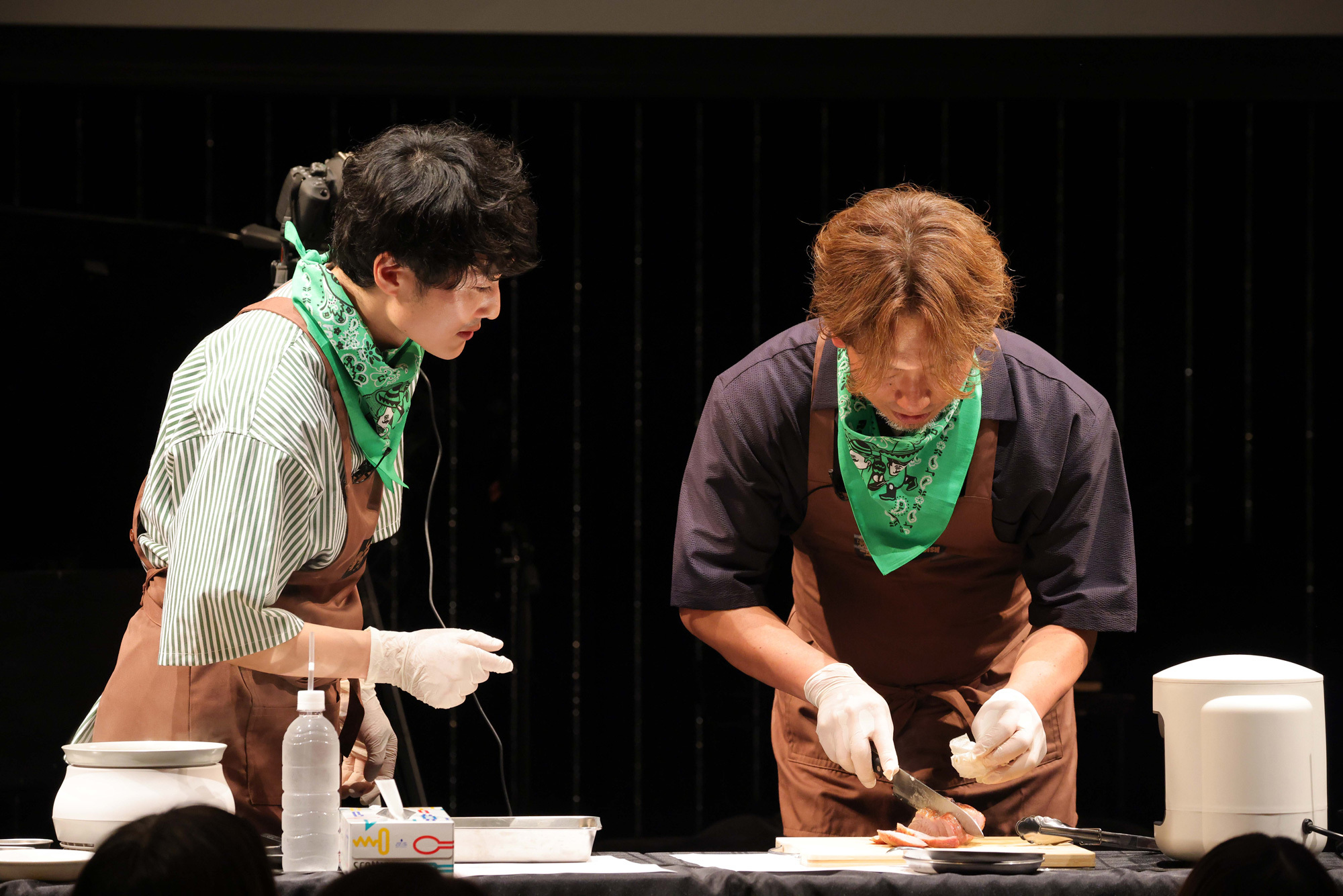 続いて金澤の豆スープを口にしたふたりは、「面白い!食べたことない味!最後にミントの香りが鼻に抜けるのがいい。塩加減も完璧です」(ホリエ)、「すごく爽やか。体にスっと入ってくる。今、4時間生放送やってきたけど一気に疲れがとれた。このスープなら食欲なくても食べられます」(ヒロト)と食レポの腕を惜しみなく披露。ちなみに豆スープには、今回グッズで販売されていた「料理部特製SPICY HOT SAUCE」を加えて味変しても美味しいそう。「オーダー通りで、100点越え!このイベントのゲスト、ずっと僕でお願いします!(笑)」と美味しい料理に感動した様子のホリエだった。
