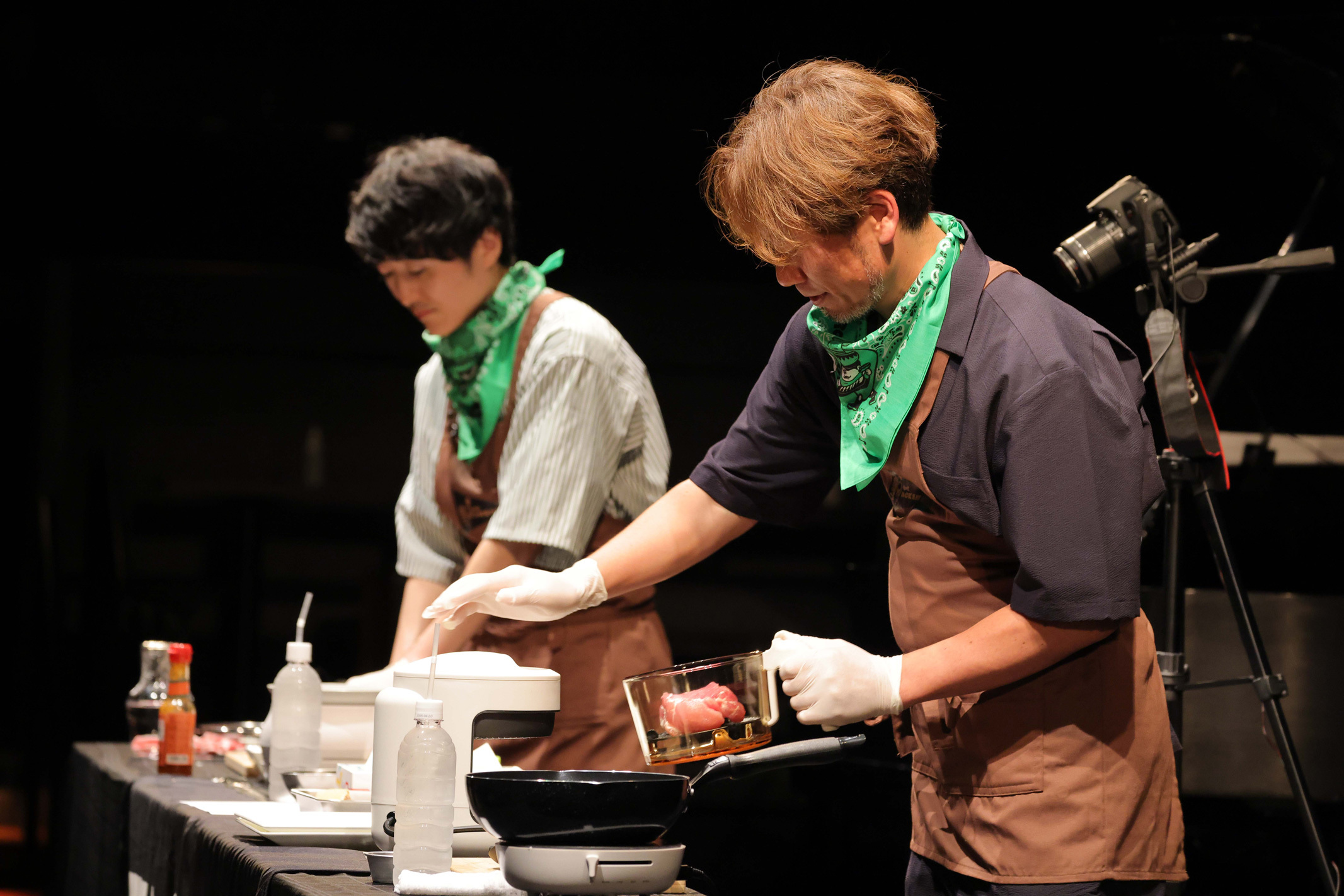 部長を務める伊地知潔は、料理研究家という肩書きを持ち、自身の料理Youtube『KIYOSHI'S KITCHEN』でも活躍中。副部長の金澤も伊地知とともにレシピ本を出版したことがあり、料理好きとして知られる。そんなふたりが今回、おもてなしする相手に選んだのは、ストレイテナー・ホリエアツシ(Vo.G)だ。「普段は牛丼とラーメンばっかり食べてる」というグルメ(!?)なホリエは喜んでくれるのか。まずはステージ上で料理がスタート!