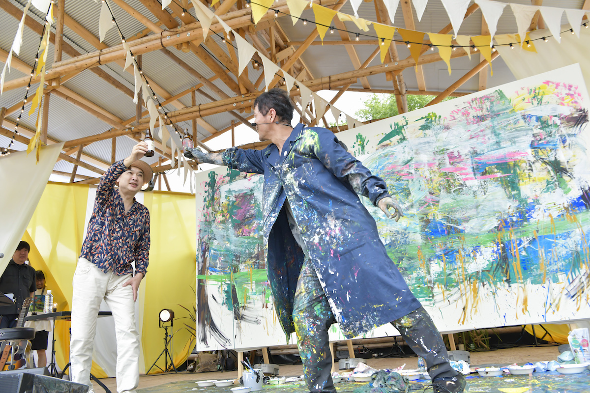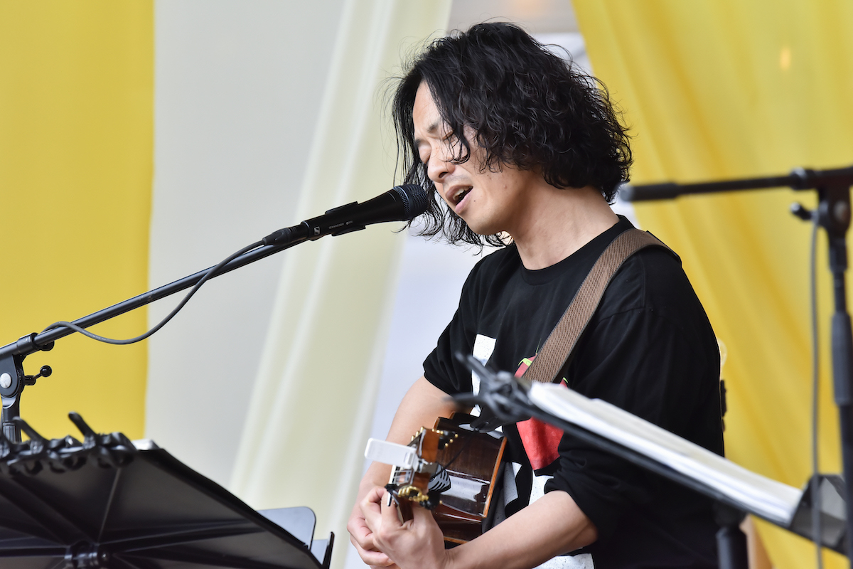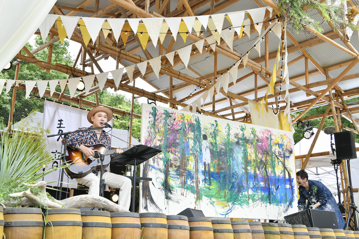 前夜はキャンパー限定の焚き火ライブ(演者はシークレットだった)で、宇多田ヒカル「光」や南佳孝「スローなブギにしてくれ(I want you)」、さらには「アンパンマンのマーチ」をカバーするなど、対象年齢の広ーいライブを見せてくれた浜崎貴司は、2日目のライブでは一番手で登場し、自身の参加するFLYNG KIDSやカーリングシトーンズの曲を多めに披露。子どもやその親世代にクリティカルな「ビーだま・ビーすけの大冒険」というレパートリーを持っているのも強い。ライブペインターの近藤康平と共にオンステージしたのも大きな見どころで、一曲ごとに異なる情景がリアルタイムで描かれていき、それが一本のライブを通してストーリー性を帯びていく、という近藤の妙技と、浜崎の飾らない、それでいてエモーショナルな歌声が見事な化学反応を見せた。