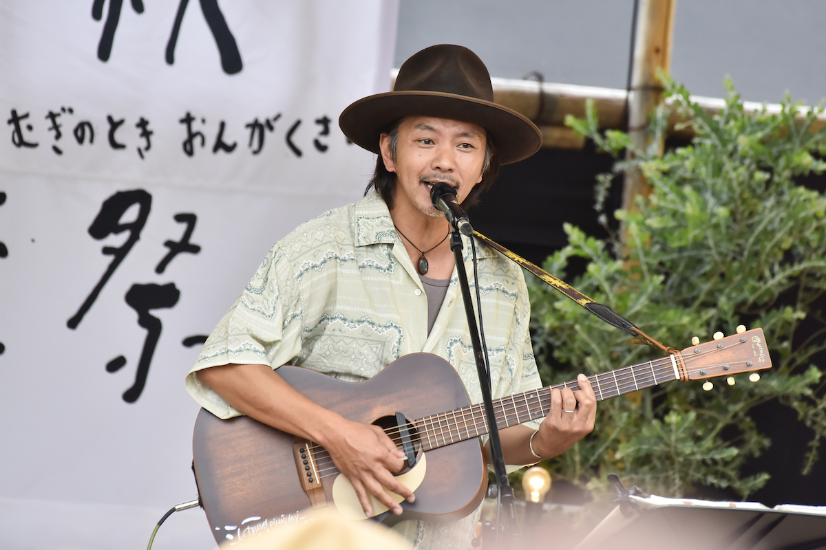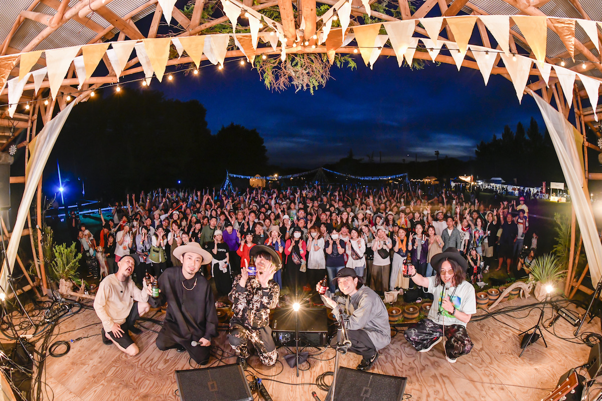 続いては、野外ライブとの親和性が究極レベルに高いCaravanだ。2日間で3度目の出番となる宮下広輔がペダルスティールを弾き、名手・椎野恭一がドラムを叩く3ピースの布陣で、彼が一曲目の「FREE BYRD」を歌い出すと、その力強く包み込むような低音ボイスでたちまち場内を虜にしていく。ラテンの香り漂うサウンドにオーディエンスを巻き込んだ勇ましいコーラスが映える「La vida es corta」や、ギターのインプロから自然と繋いだ「ハミングバード」など、ひたすらピースフルな時間が流れていくが、観客たちの熱量はジワジワと上昇していく。「何でしょうね、俺、ここすごい好きです。ちょうどいいこの規模感」と、我々の心情を代弁するかのように『麦ノ時音楽祭』を讃えたCaravanもまた、このフェスに欠かせない存在の一人と言える。