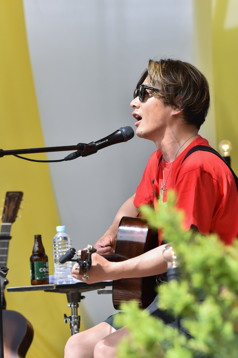 「リハーサルから結構時間あったから酔っ払っちゃった」とビール片手に登場したのはイッチャンことLOW IQ 01。ど頭から「WHAT'S BORDERLESS?」「Snowman」と歴戦のライブチューン、パンクチューンを畳み掛け盛り上げるが、アコギ一本の弾き語りのためかどこかアイリッシュやカントリーっぽく聴こえるのが面白い。そこに輪をかけて面白いのが奔放なトークで、自らを中井貴一と称してみたり、ACIDMAN・大木のモノマネを披露して自画自賛してみたり。どれもこれも彼のサービス精神の現れであり、それはアドリブで某名作ゲームのBGMを弾いた後、その主人公の格好をした子どもを発見してもう一回やったシーンにも溢れていた。ラスト、中井貴一だったはずの男は「横山健でした!」と言い残し、「Hangover Weekend」をビシッと打ち込んでいった。