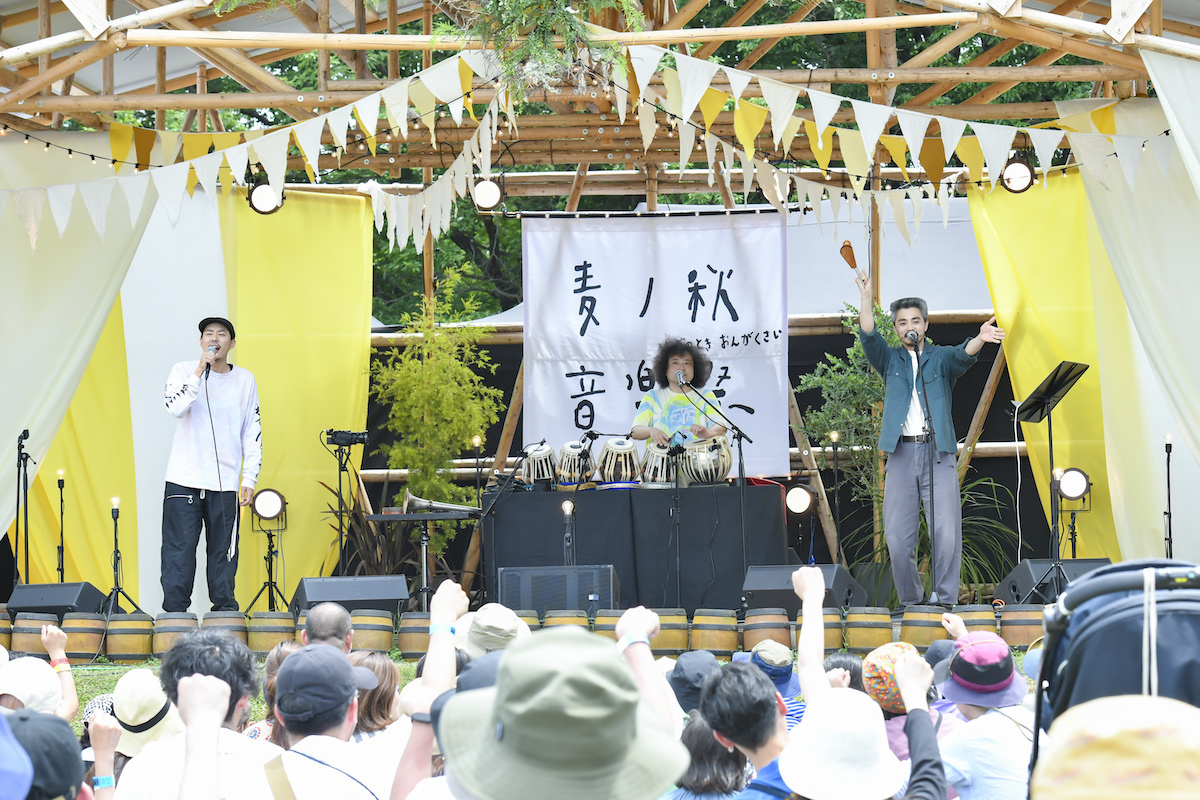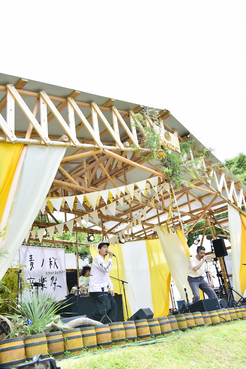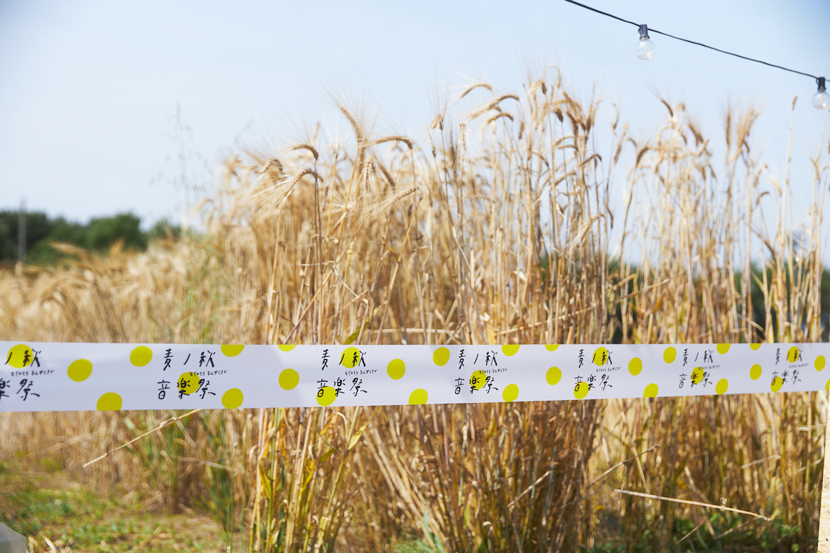 キャンプサイトからライブ会場へ向かう途中には麦畑もある。前回開催時、ここに参加者が麦の種を蒔いており、今回はその収穫をする……予定であった。「麦秋」という言葉が実は初夏の季節を指す通り、本来であればこのくらいの時期が麦の収穫にはベストなのだそう。それが前回から半年というスパンで開催する理由の一つでもあったのだが……今季は気温の高い日が多かったことで、開催前週の段階で麦の収穫をせざるを得なくなってしまった。この手痛い誤算が、結果的に嬉しい発表へと繋がっていくことになるのだが、それについては後述する。