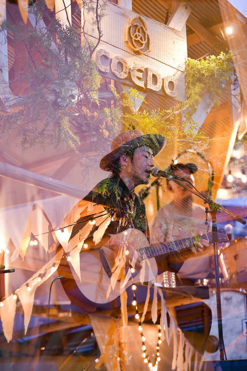 さて、夜のキャンプタイム。もちろんお供はCOEDOだ。7時頃、すっきり起床。朝市をやっているのでサンドイッチとコーヒーを購入。今後のための情報として残しておくと、昼間の気温はかなり高めだったこの日でも、陽が沈むとだいぶ過ごしやすい気候になって、寒くはないが何か羽織るものがあるとちょうど良いくらい。お風呂に関しては車のある方なら15分圏内に温泉施設がいくつかあるが、ビールを存分に楽しむ前提であれば、翌朝に行くのが吉だろう。筆者が行ったところは9:00からやっているので、ひとっ風呂浴びてから戻ってきても2日目のライブスタート(11:00)には余裕です。