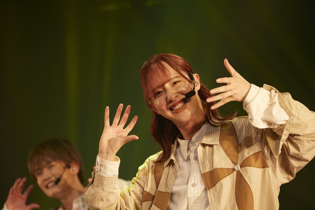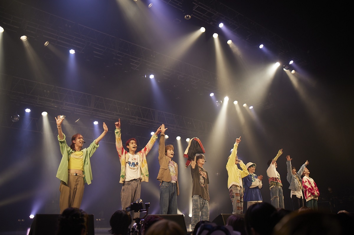最初のMCでは、みんなでわちゃわちゃと自己紹介。A.rikが発案した声出し用のコール&レスポンスにトライすると、会場の一体感はより一層増していった。メンバーがステージから去り「OBENTO ~お弁当の歌~」のイントロが流れ、熊澤歩哉と草地稜之が観客席後方から登場。オリジナルのトークパートや草地が熊澤をお姫様抱っこする演出に、会場からは恍惚の声が漏れまくる。続く「We are ENJIN」では残りのメンバーも客席から姿を現し、声にならない喜びが会場に満ちていった。パンデミックの影響により近づくことができなければ、声をだすこともままならなかった3年間。至近距離でコミュニケーションを取りながら作りあげていくライブを、円神自身もファンも噛みしめていたことだろう。「Dressing is a way of life」では“You&Me 夢叶えよう”と高らかに歌が響き、できなかったことを少しずつ可能にしていく未来を予期させた。
