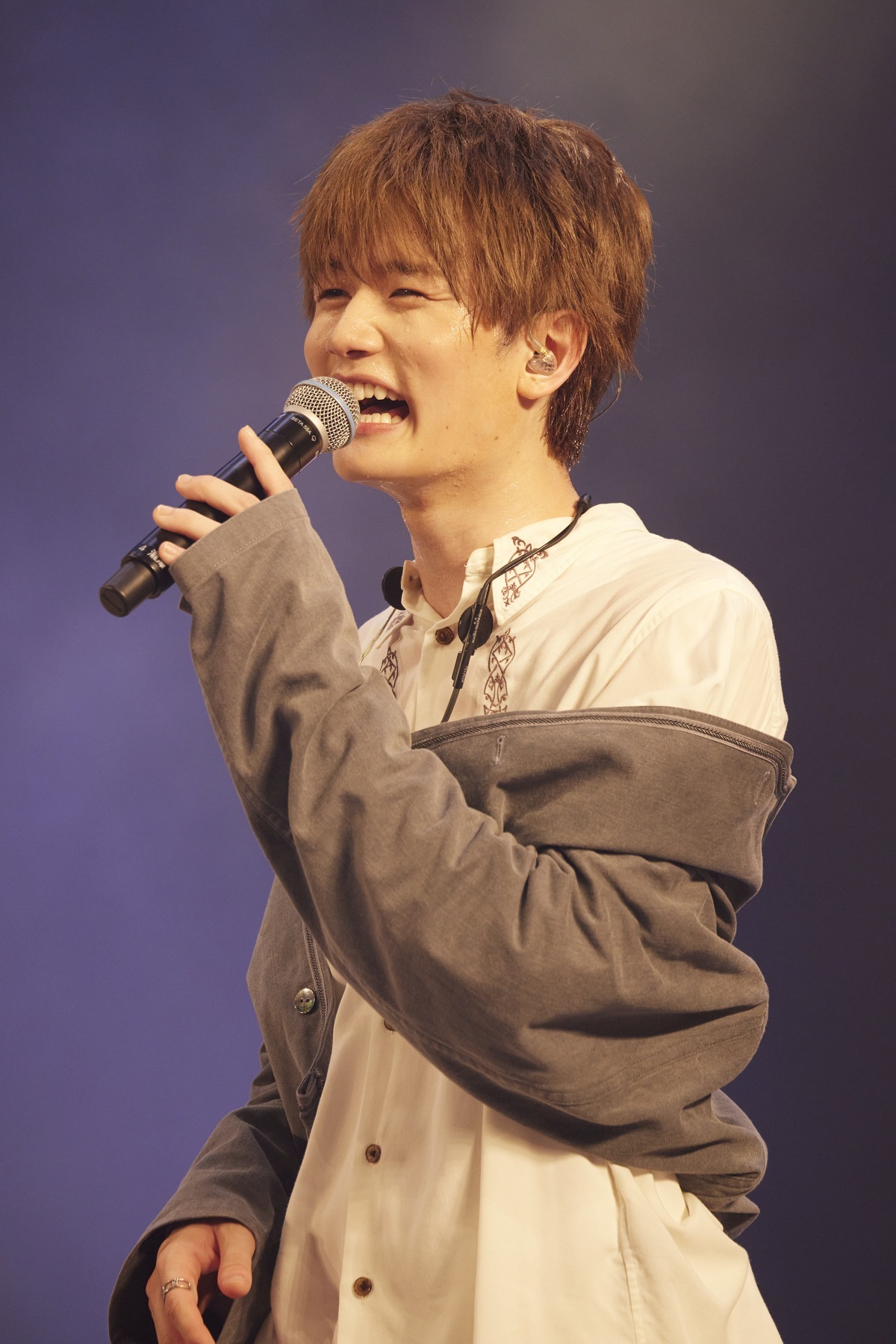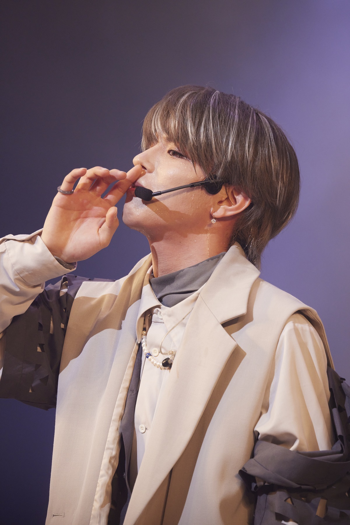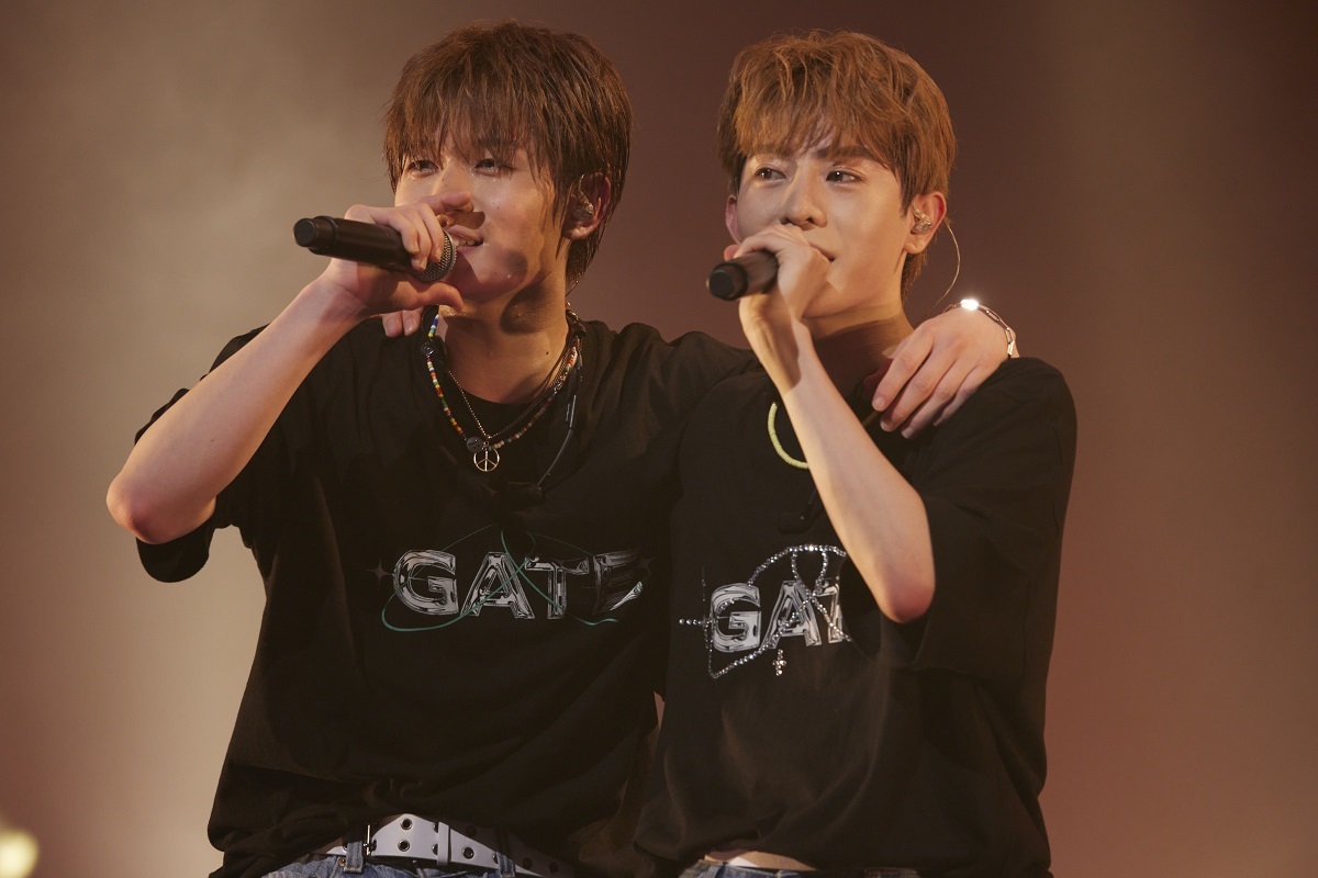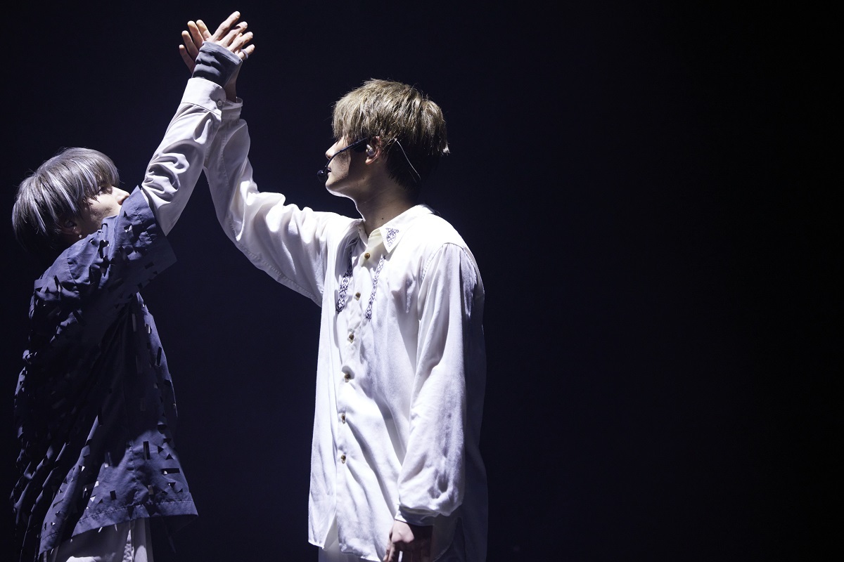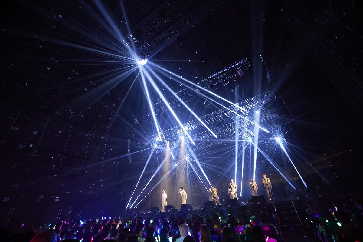 「Highway In Blue」から始まったしっとりパートでは、それぞれがハンドマイクを持ち、声にしっかりと想いを乗せていく。夕焼けのようなオレンジの照明をバックに「Far away」を丁寧に紡ぎあげると、宮里と中本大賀のアカペラパートを皮切りに「YOU」へ。クルクルと回るミラーボールは舞台に星空を作りだし、会場はロマンチックな夜のムード。暗転のなかでピンスポットを一身に受けながら繋がれていく歌には熱が宿り、言葉の意味以上の感情が乗っていく。いうならばそれは、上手いとは別の次元で間違いなく存在している“伝わる歌”。歌唱終わりには、想いが届いたことを示すように、自然り拍手が巻き起こった。しかし、感動の波はここで終わらない。デビューステージ『nonagon~始まりの音〜』でキーソングとなる「To The Light」の導入が流れると、すでに会場には歓声が。瀧澤翼と宮里は当時の感情をそのまま注ぎこんだようなエモーショナルなパフォーマンスを披露し、見る者の涙を誘ったのだった。