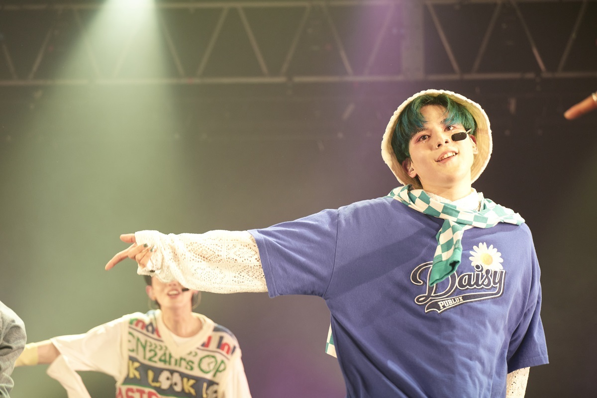 折り返し地点には、3周年記念デートをテーマとしたVTRが映し出される。それぞれのデートシーンが終わるとシームレスに「Anniversary」へ誘われ、スクリーンの中と同じY2Kファッションに身を包んだメンバーが出現した。色っぽくダークな雰囲気の「Wanna Love Me」、中谷日向・中林・中本のリアル関西弁が活かされる「Messing Around」、山田のフリースタイルラップで惹きつける「Gunshot!!」と、続けざまにヒップホップチューンを披露。瀧澤を筆頭に展開されたダンスパートでは、再びアクロバットも魅せつけ、ダンスパフォーマンスでも魅せられる円神を印象付けた。