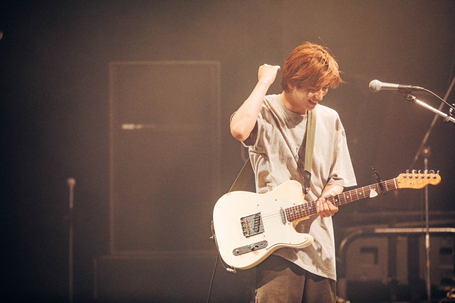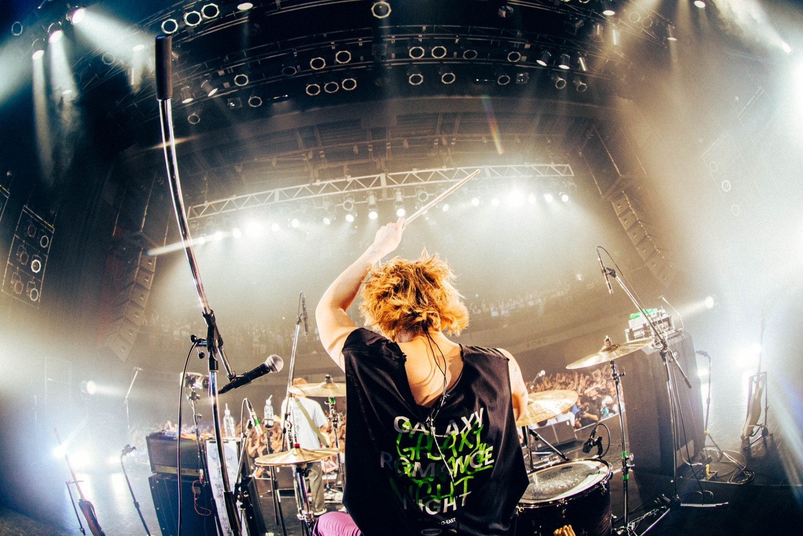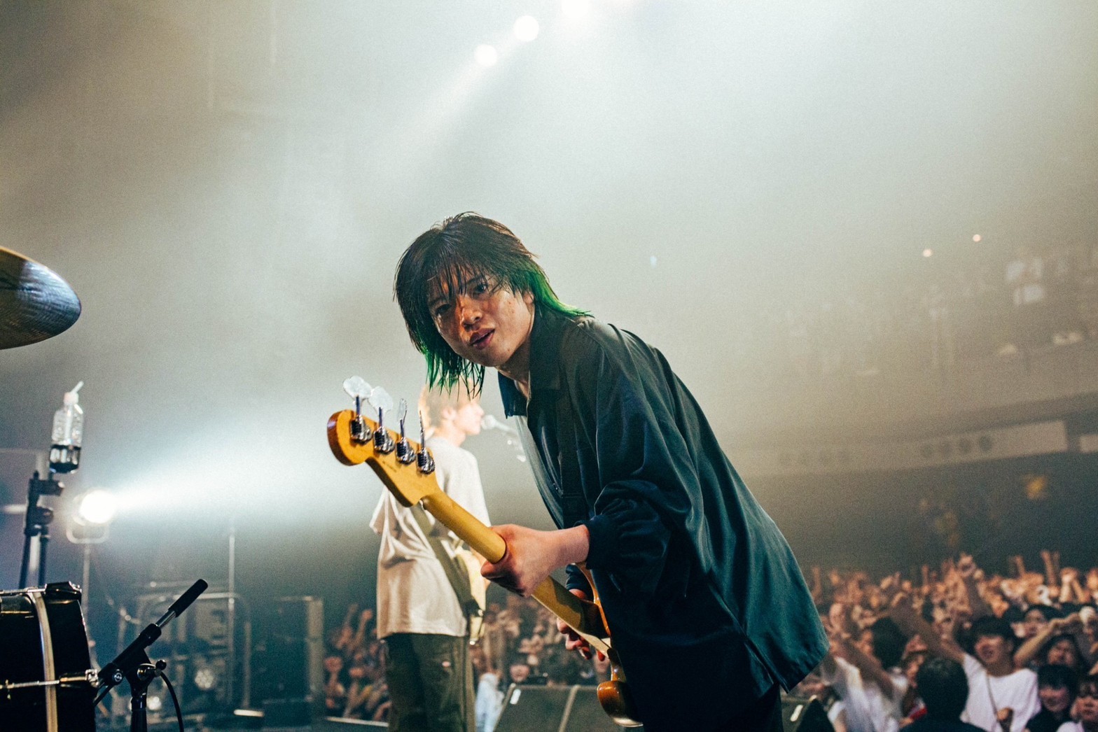 音を止めずにチューニングを合わせていた岡本が、後半戦の開幕を高らかに告げる。スローダウンしていた観客が再び激しく動き出す。アップテンポで疾走する「最後は繋がる分かれ道」から「CAUTION」、そして「フロントライン」へ。MCタイムではないはずだが、岡本が曲を止めて語り出す。音楽に夢中だった高校生が、いつのまに音楽を生き方にしていたこと。ライブハウスがきっかけをくれたこと。バンドの将来を揶揄する声をはねのけ、「今パンパンのO-EASTでライブやってます」と誇らしげに叫ぶ岡本に向けられる祝福の拍手。「突風」「星とオレンジ」「これっきり」へ、曲の繋ぎ目もわからないほどノンストップの全力疾走。フロアは熱狂、ダイブの嵐だ。