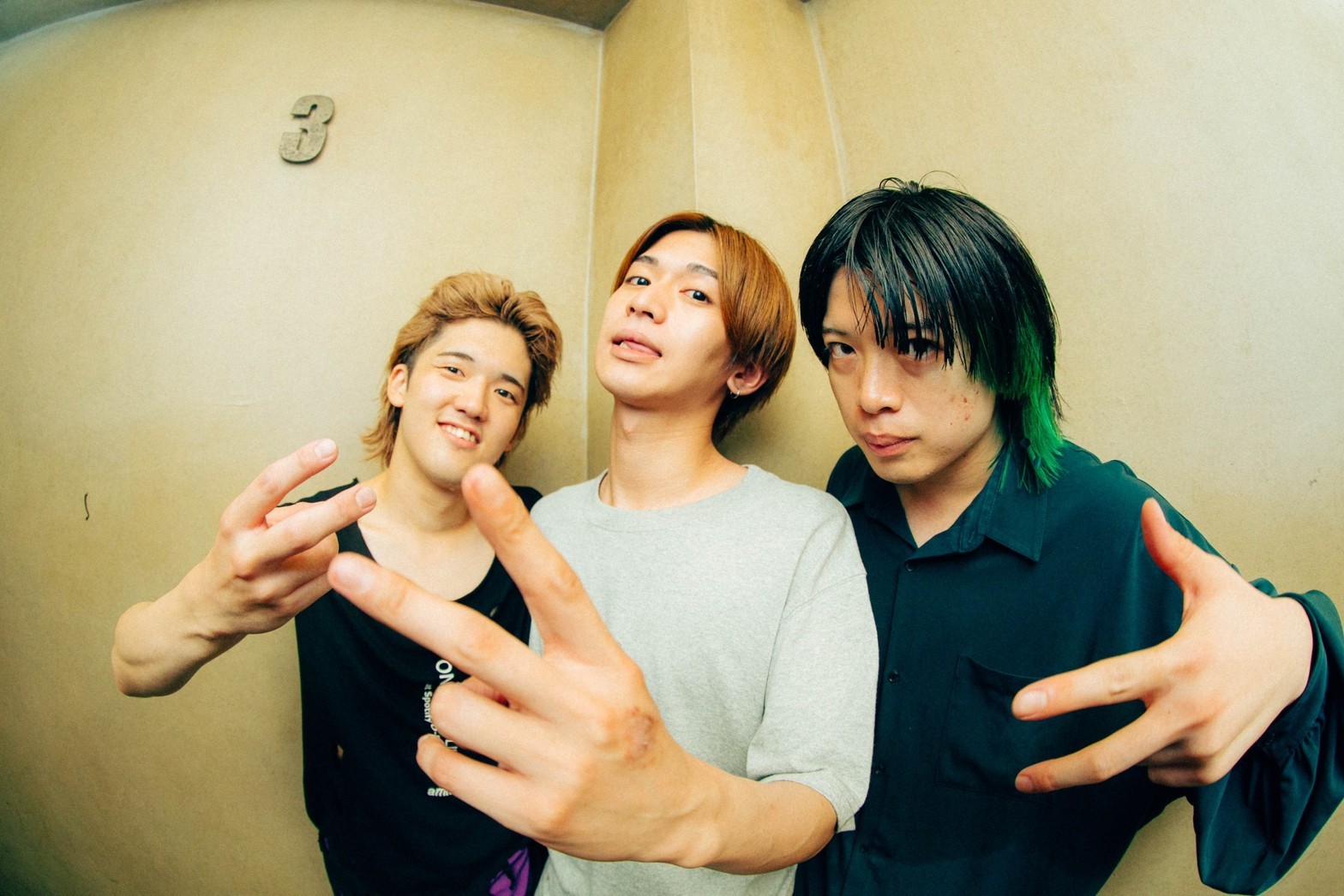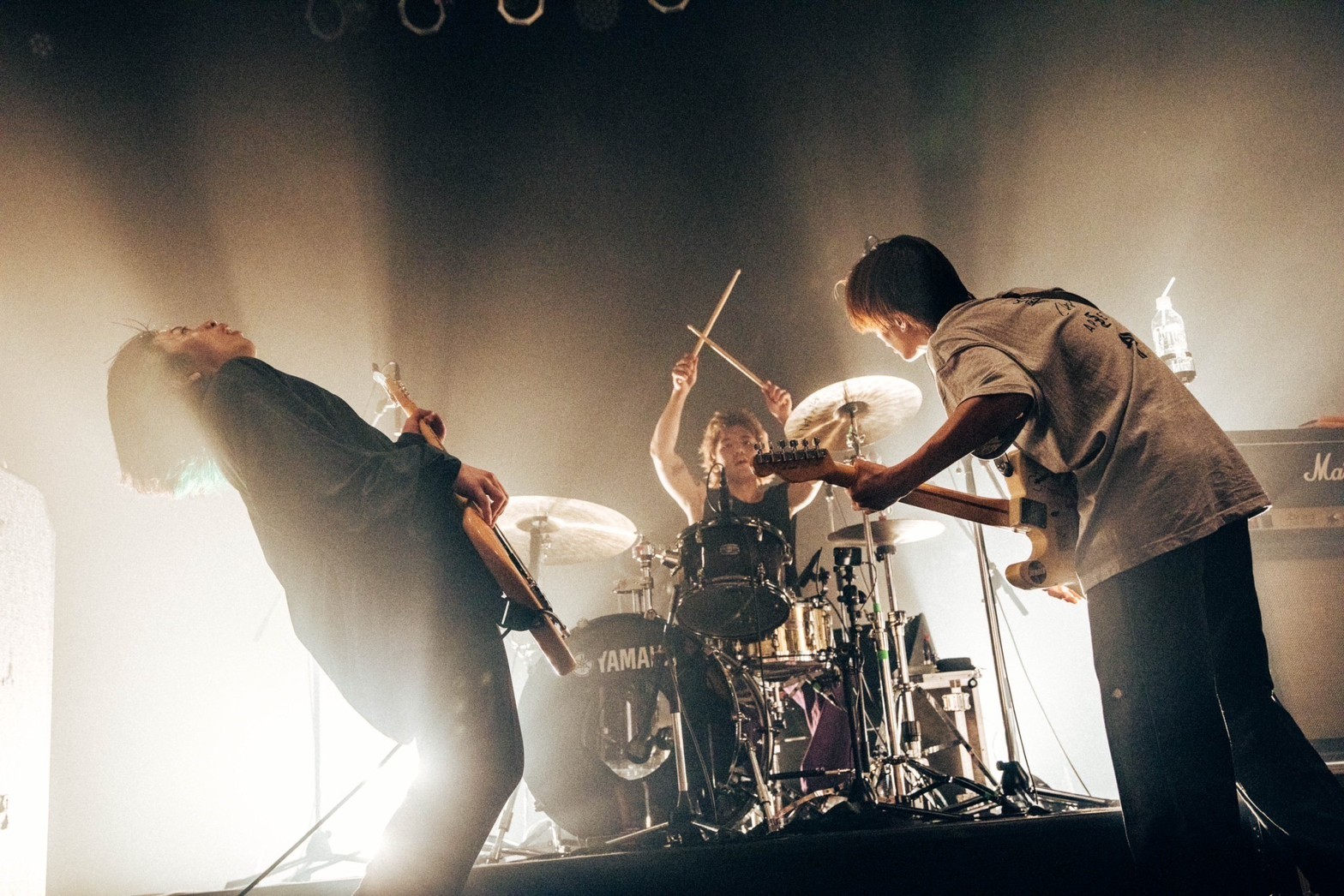 フロム大阪、ammo始めます――。ボーカルギター岡本優星の名乗りが聞き取りづらいほどの大歓声がフロアを満たす。1曲目「ハート・フル」から「未開封」「深爪」と、ほぼ曲間無しで激しくエモくアップテンポの楽曲が立て続けに投下される。端正な顔を崩さずにギターを搔きむしりマイクに言葉を叩きつける岡本優星。ふてぶてしさ満点で音数の多いベースラインを操りながら激しく動き回るベースコーラスの川原創馬。いかした金髪ウルフカットとしなやかな二の腕でパワフルビートを叩きまくる北出大洋。いきなりの新曲も、ammoらしい直情径行なパンクチューンですんなりセトリに溶け込んでる。4曲やって10分ちょっと。すごいスピード。