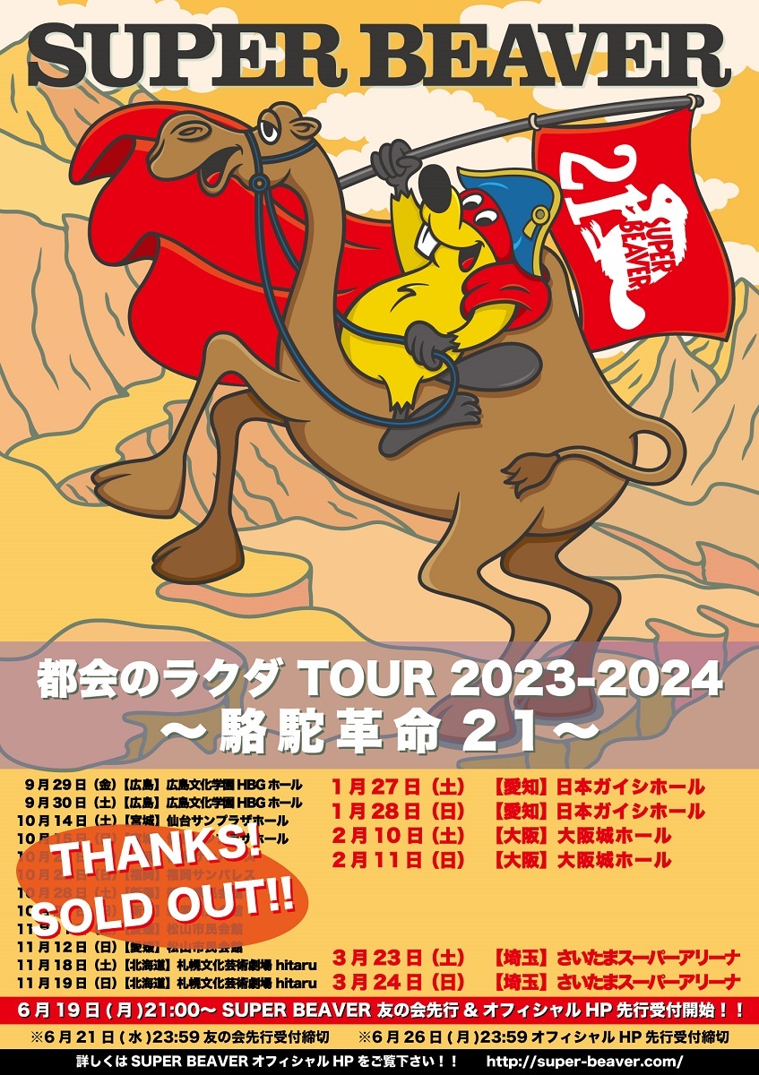 SUPER BEAVERが、2023年9月から実施するツアー『SUPER BEAVER 都会のラクダ TOUR 2023-2024 〜 駱駝革命21 〜』の愛知・大阪・埼玉公演の開催を発表した。