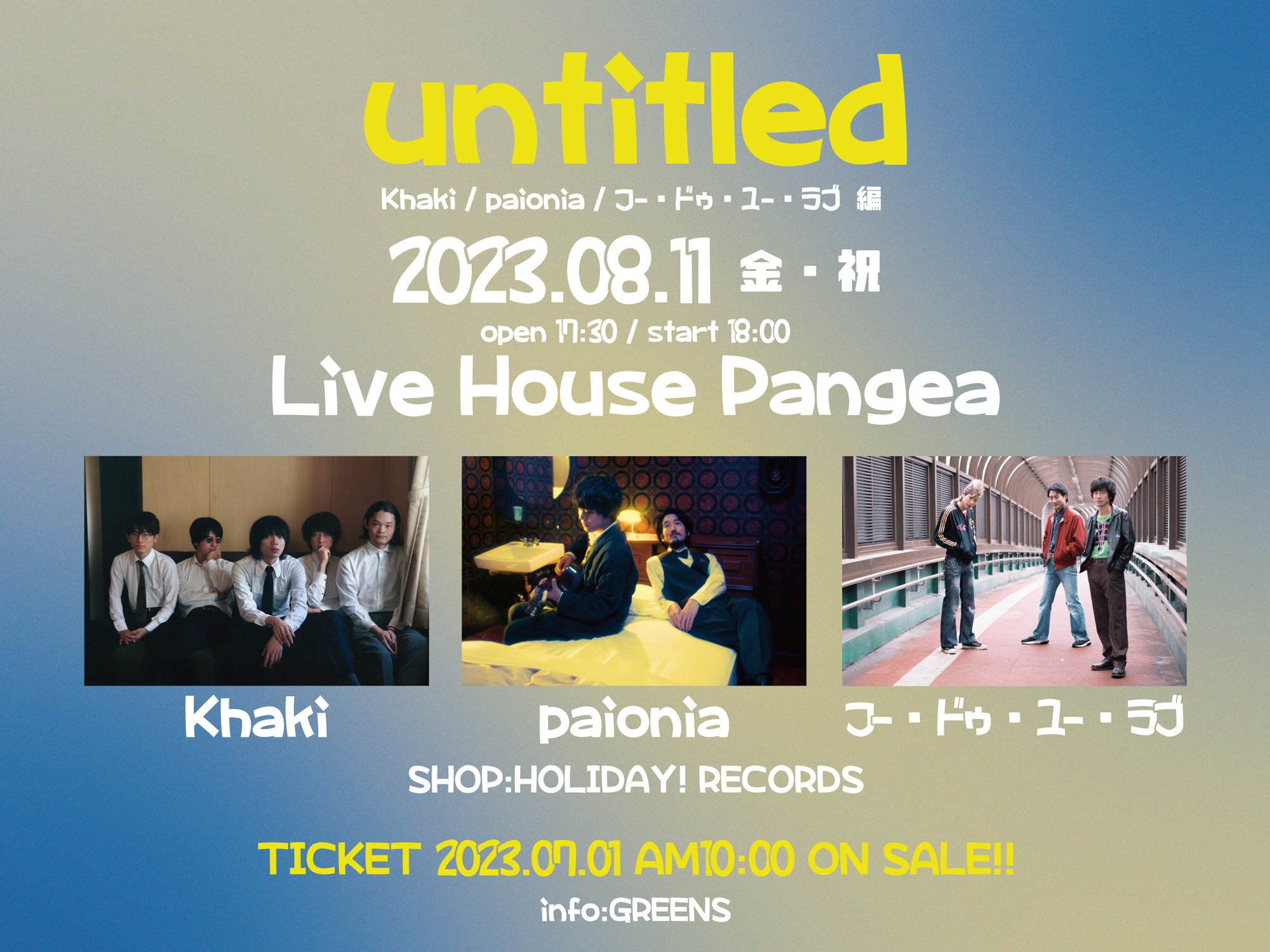 8月11日(金祝)、大阪・Live House Pangeaにて『Untitled』が開催決定。Khaki、paionia、フー・ドゥ・ユー・ラブのスリーマンライブとなる。