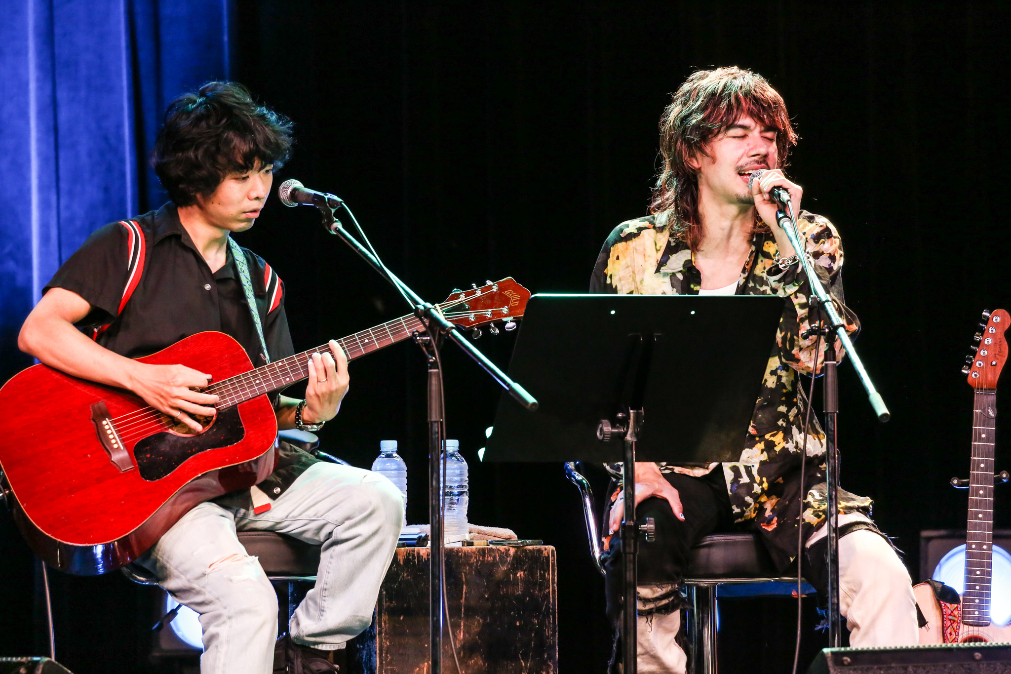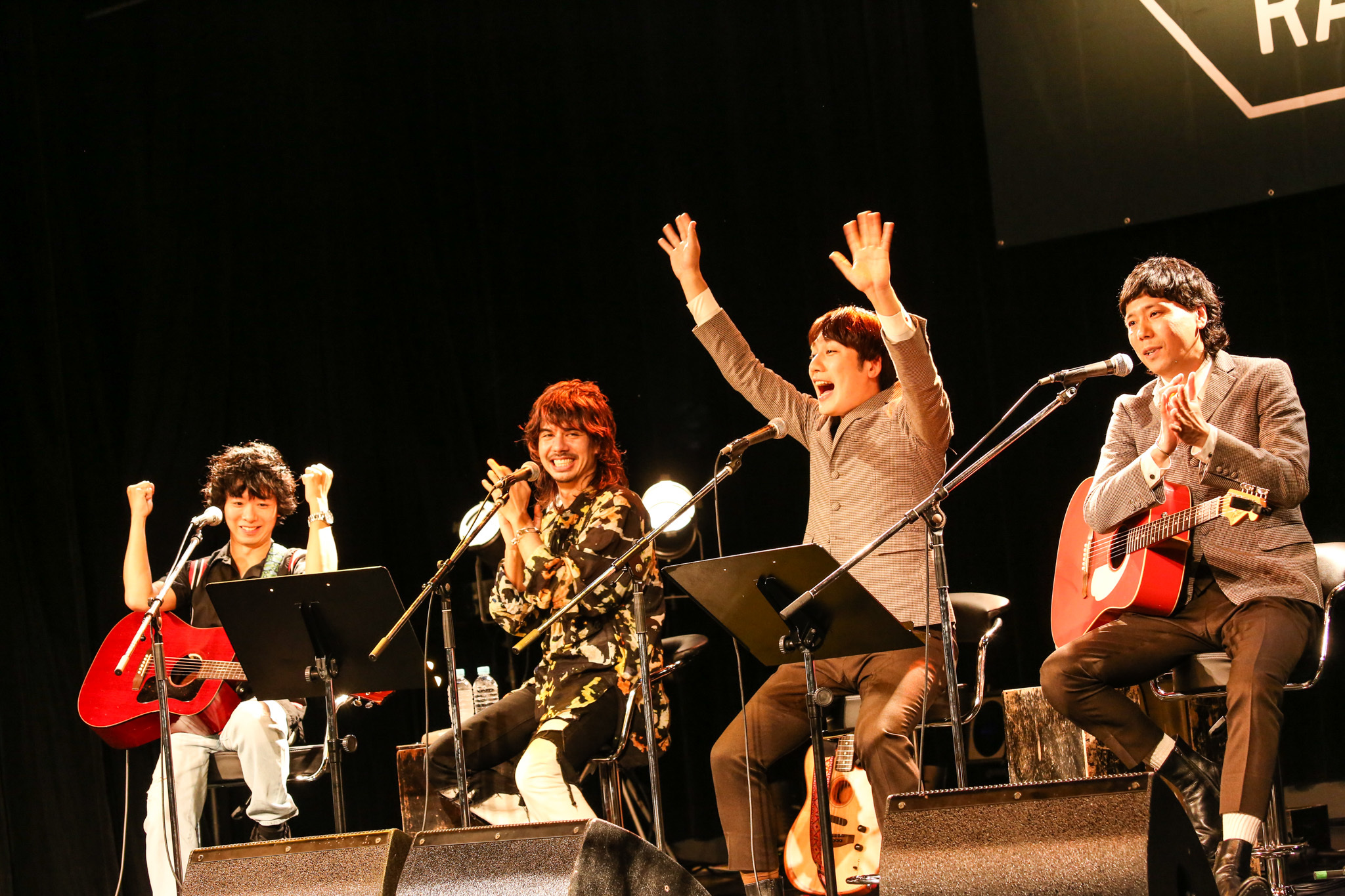 続くアコースティックライブでは、2組が各1曲、4人でカバーを2曲の計4曲を披露。TAXMANの小気味いいギターとROYのハイトーン&シャウトで鳴らす「HOT DOG」には、「アコースティックでできるんだ!」とコウキも感嘆。一方ショウとコウキもアコースティックだからこその美しい気だるさが際立つ「DOOR」でROYとTAXMANから称賛の拍手を引き出す。そして全員で奏でるのは誰もが知る世界的名曲。観客が圧倒されたのは言うまでもないが、4人も演奏後に「大成功」、「いいね」と口にするほど手ごたえを感じたようだ。