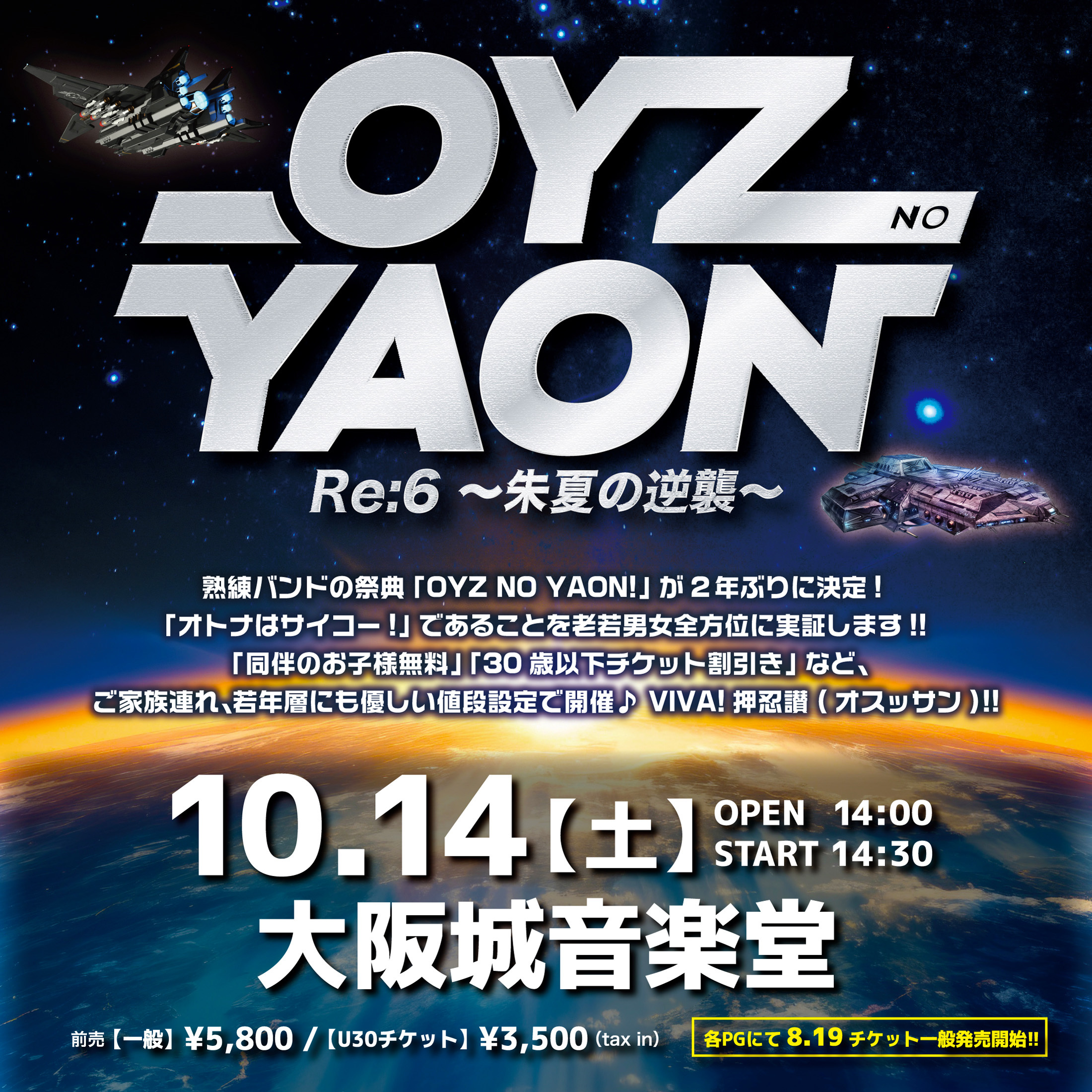 関西のコンサートプロモーター清水音泉が主催するライブイベント『OYZ NO YAON』(オヤジノヤオン)が、10月14日(土)に大阪城音楽堂にて、2年ぶりに『Re:6 〜朱夏の逆襲〜』として開催される。