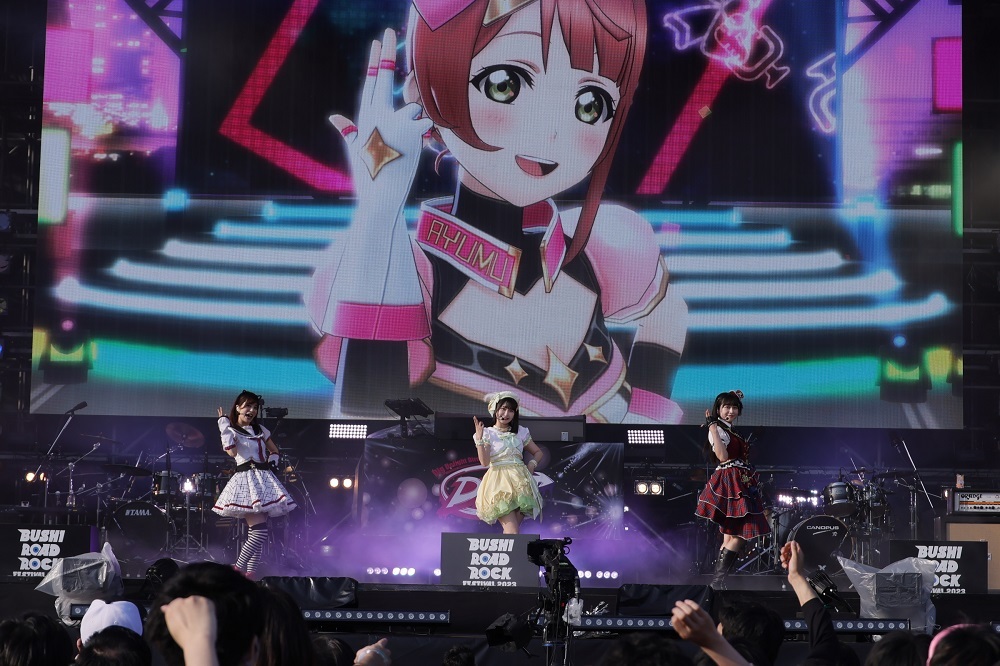 虹ヶ咲学園スクールアイドル同好会の3名が「繚乱!ビクトリーロード」と共に乱入してくると、場内のボルテージもさらに跳ね上がり、ドンドンと曲中に出演者が増えて最終的には、“虹ヶ咲学園スクールアイドル同好会×山手響子×犬寄しのぶ×青柳椿×桜田美夢×チュチュ×倉田ましろ”というとんでもないコラボが実現した。これは本当にすごいことで、筆者自身、脳内がバグり続けたまま、気付けば終わってしまった。