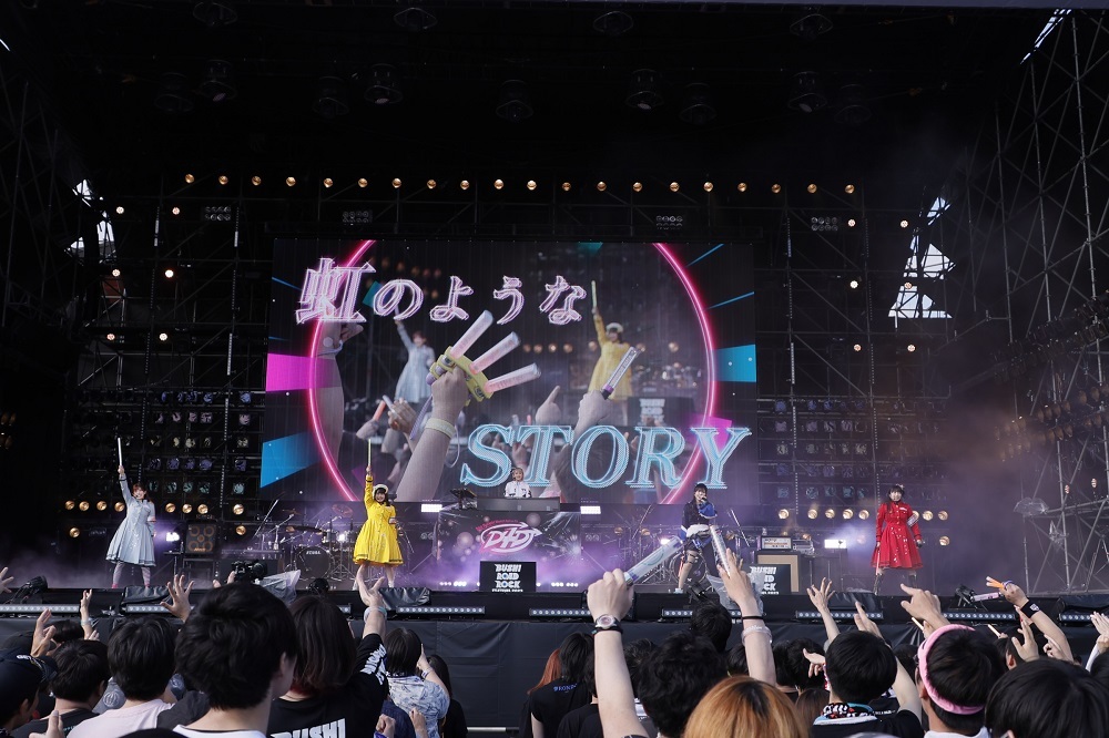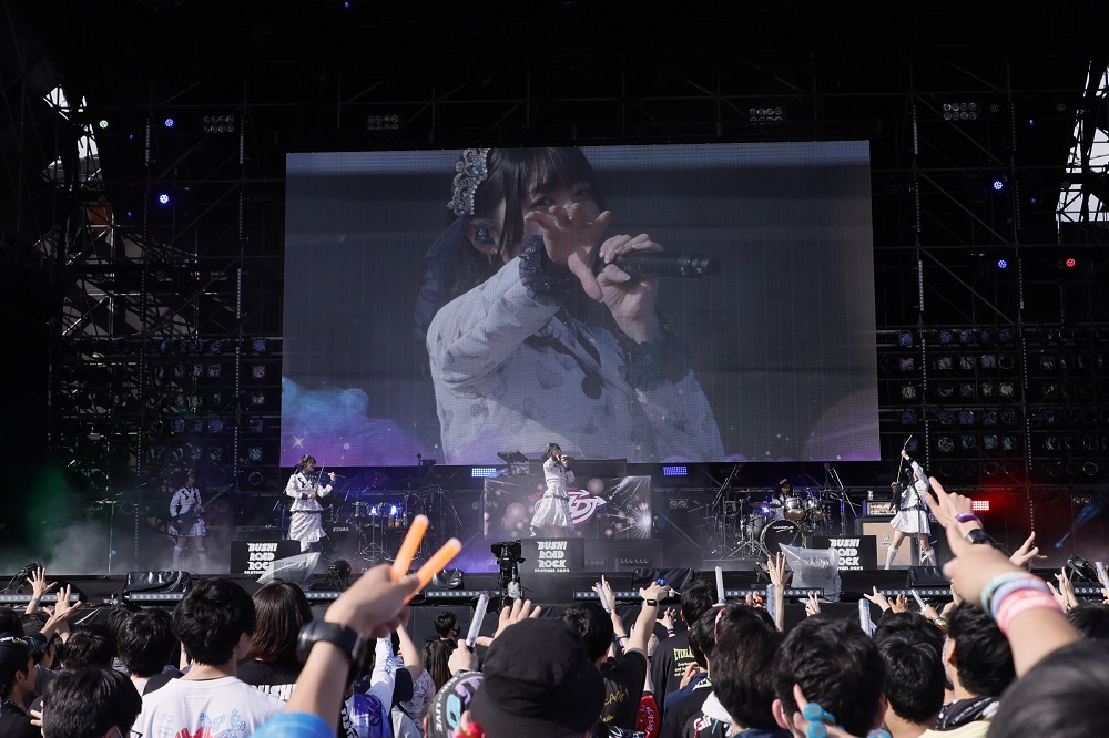ゴシックな雰囲気から繋いだのはMorfonica。挨拶代わりにデビューシングル「Daylight -デイライト-」でいつもの「ごきげんよう、Morfonicaです」を披露すると「今回は新曲を持ってきました!」と、2曲目から初披露楽曲を投下する気合いの入りよう。そんな「カラフルリバティー」も非常にコール&レスポンスしやすく、曲の2番からしっかりと順応し、声が出ていたことにも驚いた。続いてメンバー紹介を挟み「今日はロックフェス!という事で攻め攻めなモニカのセトリを持ってきたよ〜」と七深、「この調子で声出して!次も新曲です!」と透子が口火を切ると「ALIVE」のカバーを初披露し、場内も大盛り上がり。勢いに乗ったそのまま「flame of hope」で続くと完璧なコーレスで一体感を高めていく。「まだまだモニカの曲が聴きたいって人は、7月から東名阪ツアーがあるので……」と告知も挟んだところで最後に「誓いのWingbeat」を披露した。