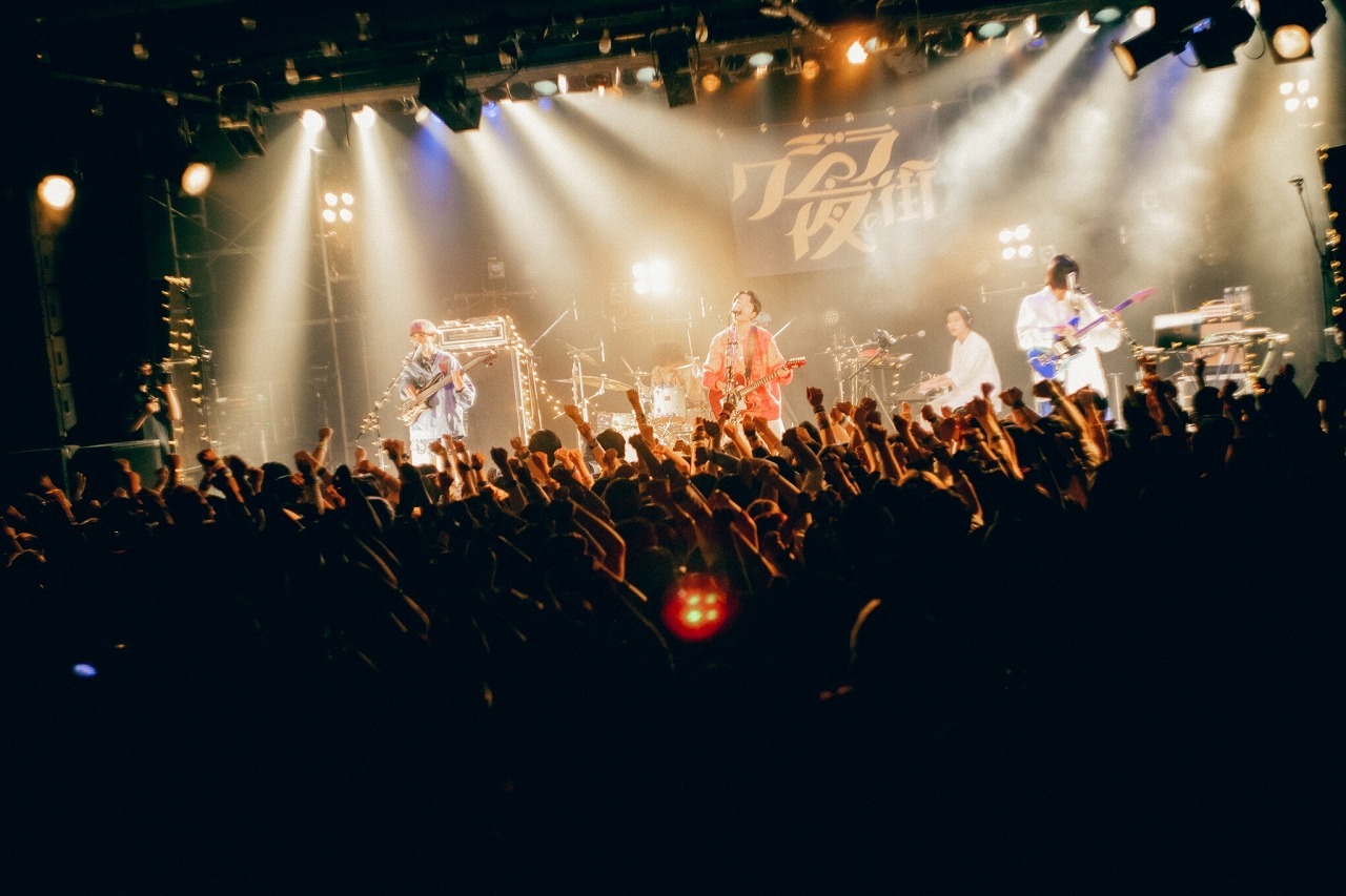 アンコールでは、新しいアーティスト写真の公開、アニメ『闇芝居 十一期』のエンディングテーマ「マスカレードパレード」のワンコインCD本日リリース、7月12日からの配信リリースと、嬉しいニュースの連発に大きな拍手が送られる。6歳になったが気持ちは新人、メジャーデビューほやほやのクジラ夜の街の未来には希望しかない。新曲「マスカレードパレード」は、複数の拍子が交錯する複雑なテンポ、マイナー調の哀愁メロディ、尖ったオルタナギターサウンドを組み合わせた、トリッキーだがキャッチーな1曲。この曲のみ撮影可ということで、観客たちが撮影した映像がTikTokやTwitterに上がっているのでぜひチェックしてほしい。