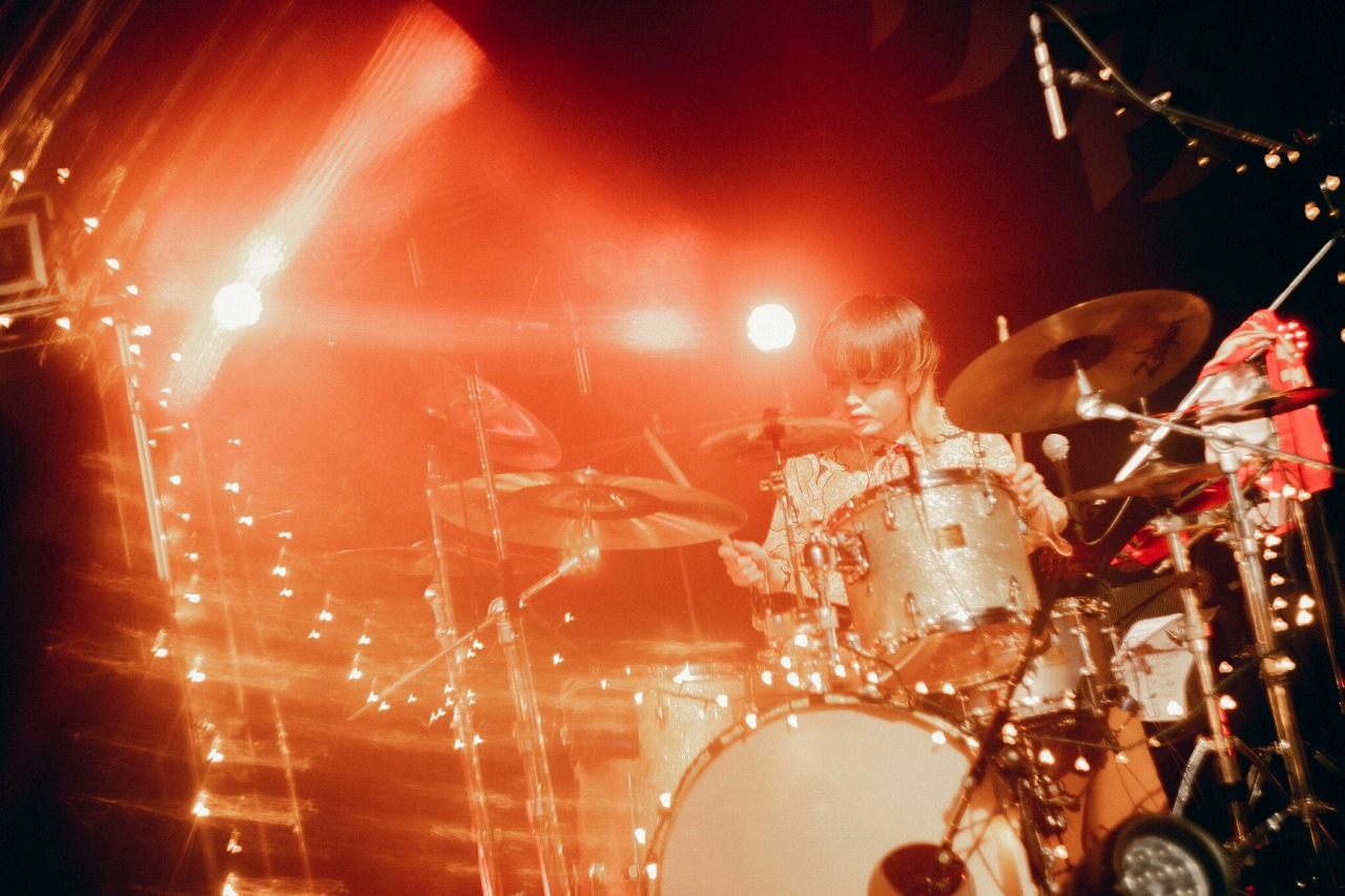 ここで一休み、MCを任されたドラムスの秦がノリノリでしゃべってる。メジャーデビューを記念して、メンバー全員に宛てた手紙の朗読は、愛とユーモアと茶目っ気に溢れた内容でフロアに笑いを巻き起こす。楽曲とパフォーマンスは作り込まれてはいても、素顔の人間味は隠さない。それがクジラ夜の街のライブ。