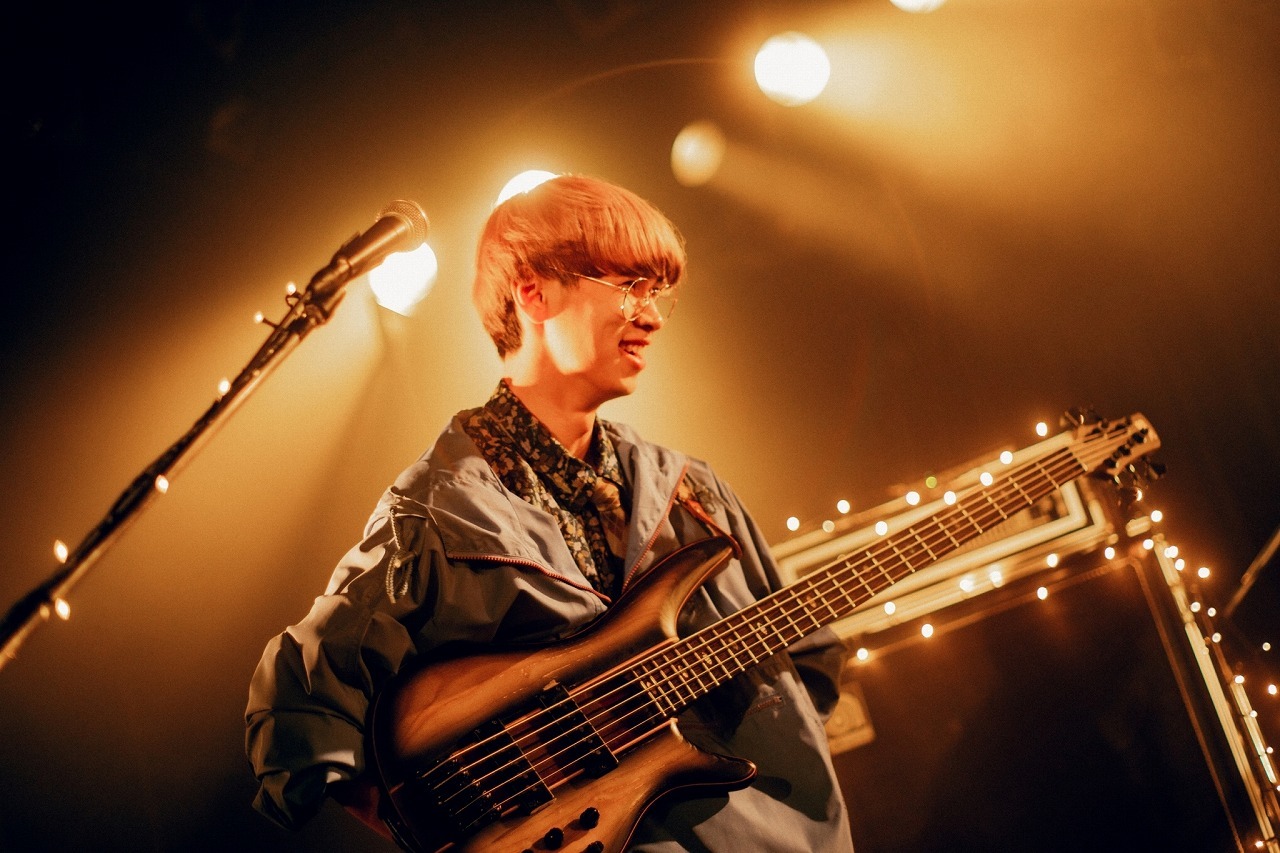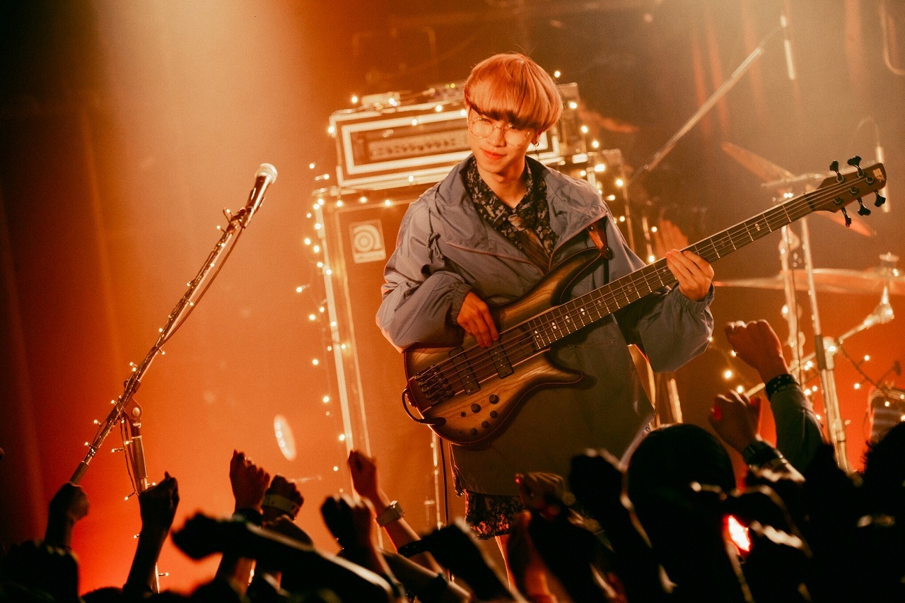 1曲ごとに物語があり、本のページをめくるように音楽は進む。サポートの高田真路が弾くピアノがコロコロ弾む「あばよ大泥棒」から「BOOGIE MAN RADIO」へ。突如“ファンタジーが大嫌いな魔王”の声が響き渡ったり、宮崎がいつの間にか黒ハットと黒マントの魔法使いモードに着替えていたり、エンタメ要素を増しながらライブは進む。5弦ベースを高く掲げた佐伯隼也がかっこいいソロを決める。キャッチーでメロディアスなギターロック、ボードビル風のノスタルジックなアレンジ、プログレッシヴロックの構成、ラウドで尖ったオルタナロック、様々な要素をミックスして才気走る演奏。主演は宮崎として、脇を固めるメンバーの見せ場も多く、視覚的にも音楽的にも飽きさせない。