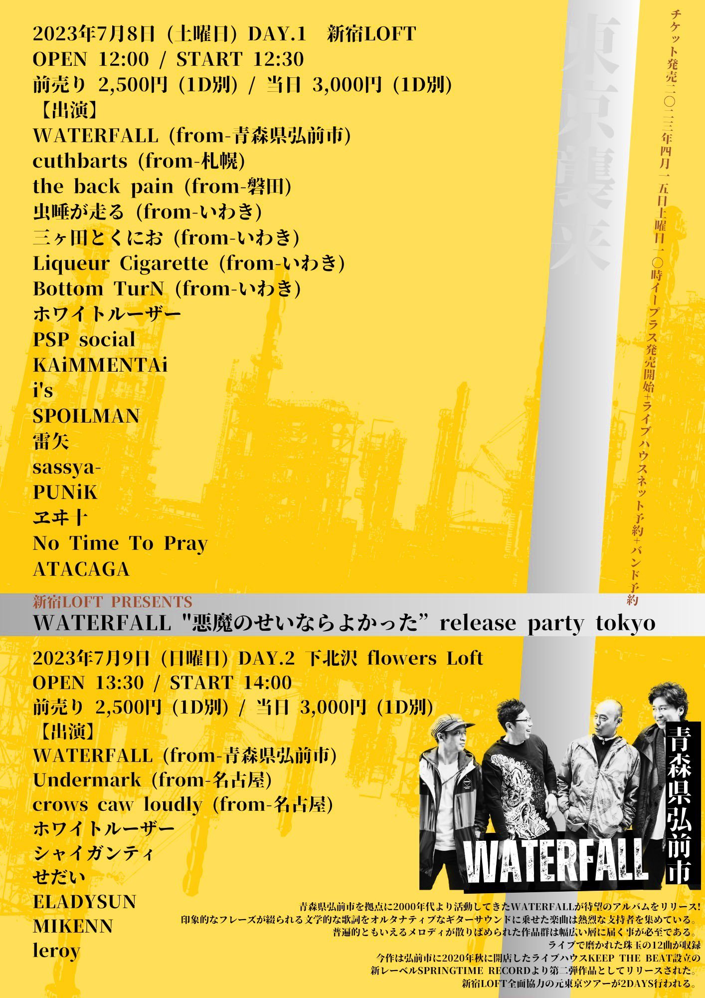7月8日(土)に東京・新宿 LOFT、 7月9日(日)に東京・下北沢Flowers Loftで開催される『新宿LOFT PRESENTS「WATERFALL “悪魔のせいならよかった” release party tokyo」』2日間全25組の出演アーティストとタイムテーブルが発表された。