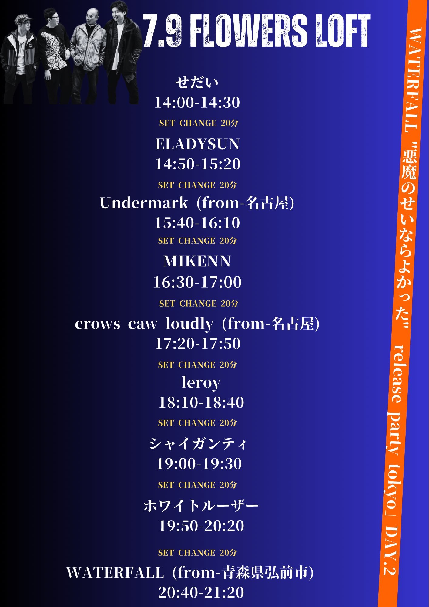 同イベントは、WATERFALLのフルアルバム『悪魔のせいならよかった』リリースを記念して2日間にわたって開催される東京公演。最終発表では、7月8日(土)新宿 LOFTの「DAY.1」にLiqueur Cigarette、Bottom TurN、PUNiK、ヱヰ十、No Time To Pray、ATACAGAの6組が出演することが決定。7月9日(日)Flowers Loftの「DAY.2」には、MIKENNとleroyが出演することが明らかに。両日全25組の出演アーティストが出そろっている。
